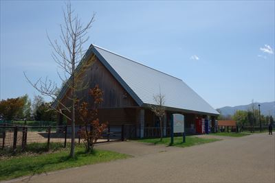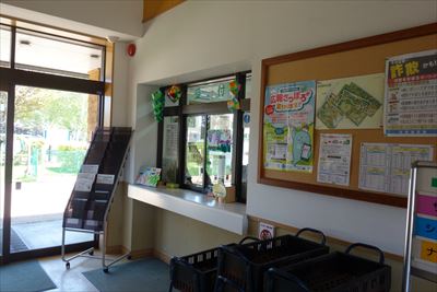 受付は、パークゴルフ場受付も兼ねた奥の窓口です。炭や軍手の販売もこちらへどうぞ。