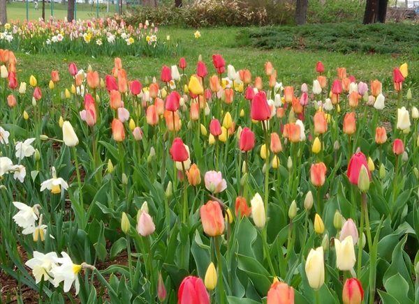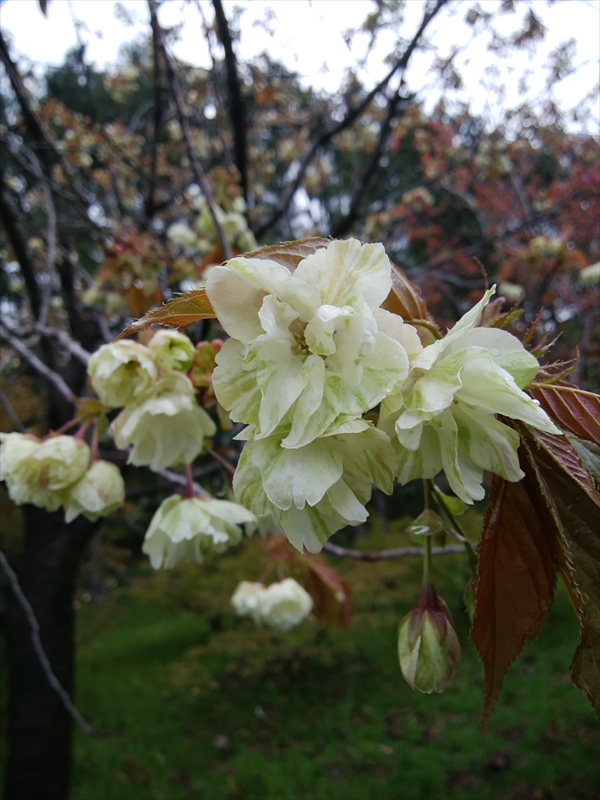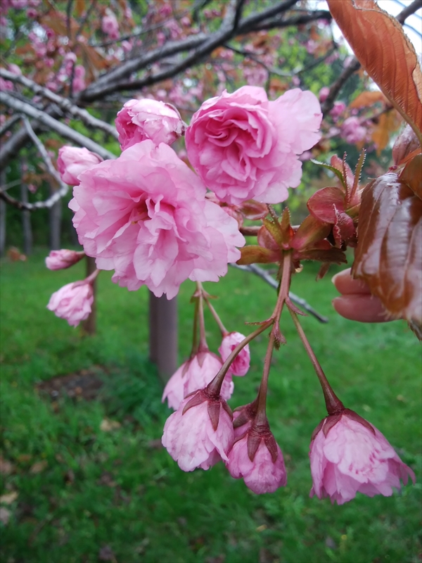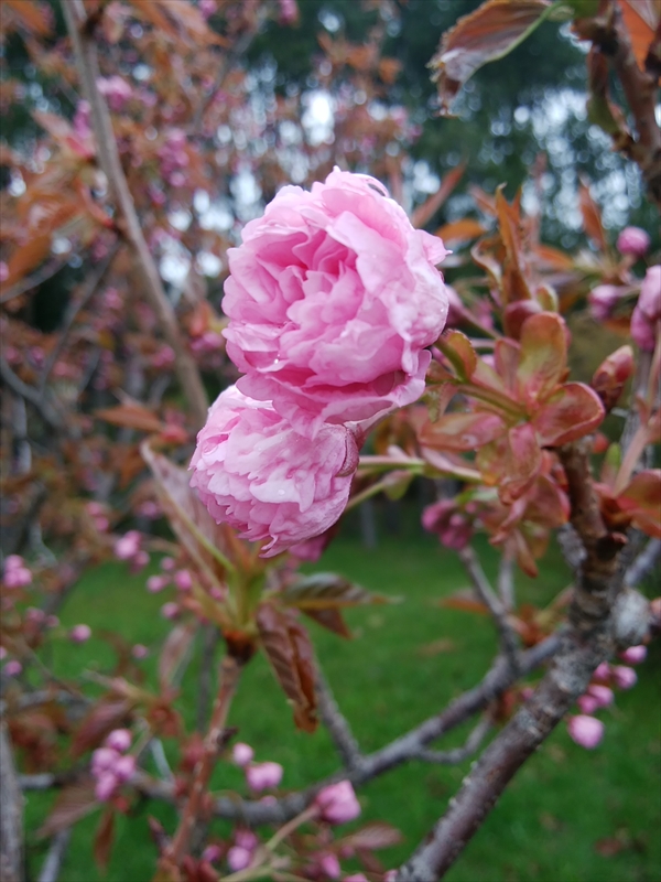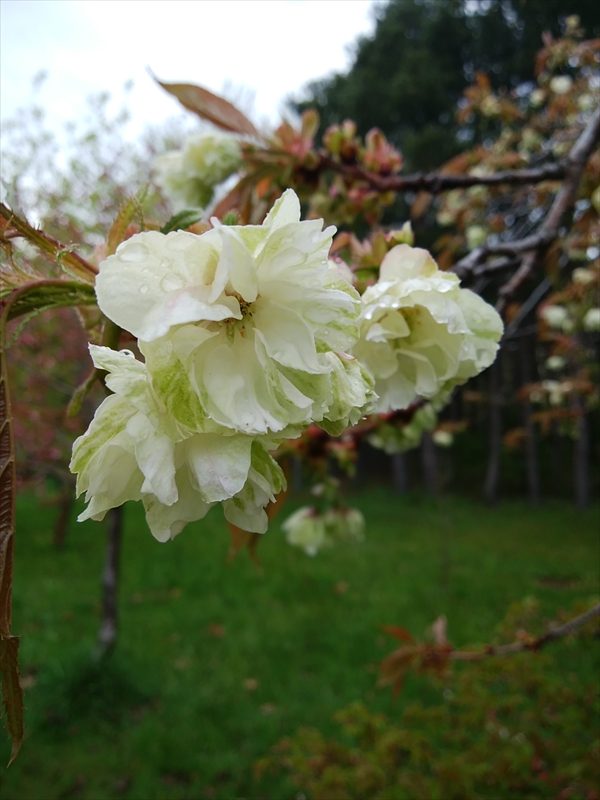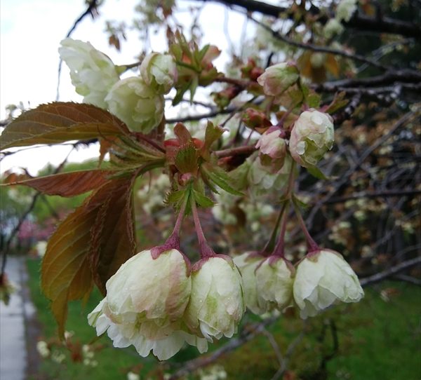 昨日(5月12日)の陽気で、ギョイコウが開花しました。 本日はあいにくの風雨で花びらの痛みが心配でしたが、なんとか大丈夫そうです。 まだまだ蕾も多く、また咲き進んでいくと緑の筋の中にピンク色が入ってくる様子もきれいなので 見頃の長い花です。 ギョイコウの横にある八重桜「カンザン(関山)」は、まだ開ききっていません。 明日のお天気に期待です。 チューリップもそろそろ開き始める頃ですので、ぜひ散策にお越しください。