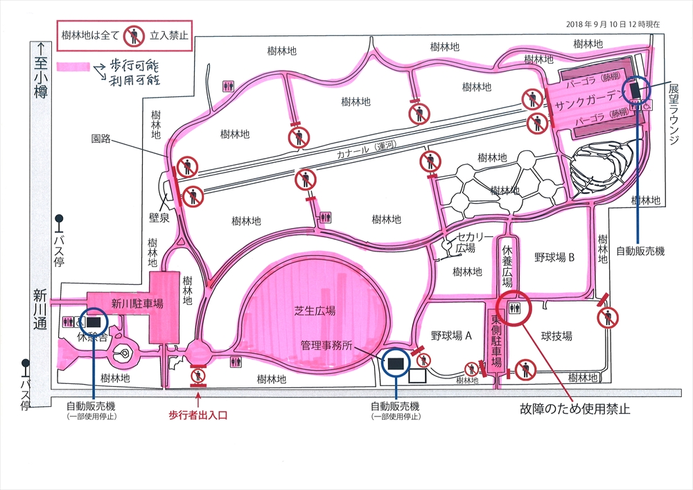 8日土曜日に電気が復旧し、園内の倒木処理及び地震による施設の安全確認を進めておりますが、本日10日の時点で以下の箇所が閉鎖又は使用不可となっております。