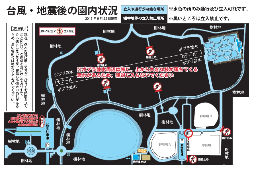 台風と地震による園内の倒木及び一部封鎖につきまして まだしばらく片付等に時間がかかりますこと、お詫び申し上げます。 現時点での園内開放箇所の図を作成しましたので、ご確認頂けます。 9月10日にお知らせしたものとほぼ変わりはありませんが、 改めてご理解頂きたく、アップいたします。 クリックすると大きくなりますので、ご確認ください。