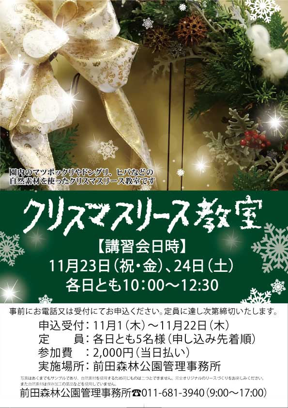 前田森林公園では、公園の植物資材を使ったクリスマスリース講習会を毎年行っています。好きなものを好きなだけ選んでいただき、オリジナルのリースを作っていただきます。