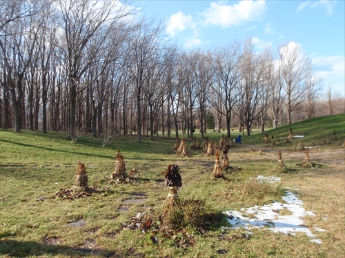 先日、集まったメンバーのみなさんと花木園のアジサイの雪囲いを行いました。