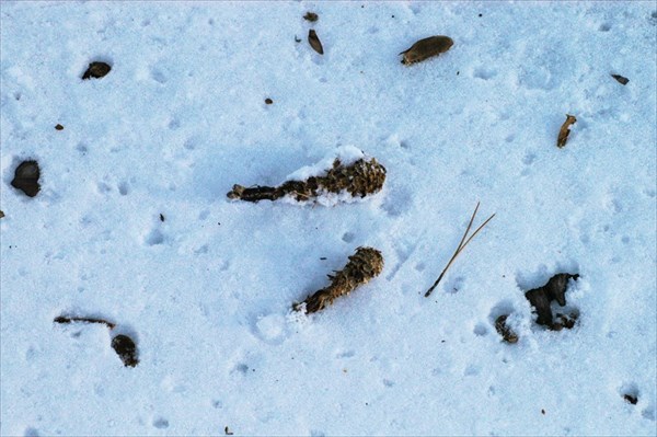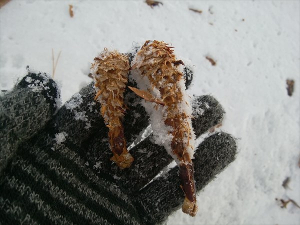 食べ終わった松ぼっくりは、まるでエビフライのように見えます。松の木の下に、これがたくさん落ちているのを見つけたら、その松はエゾリスたちのお気に入りの食事場です。