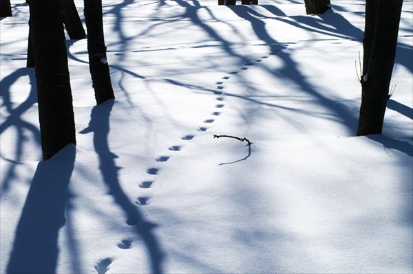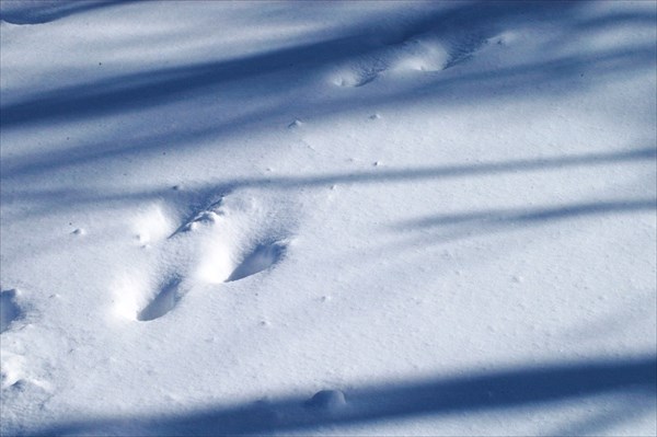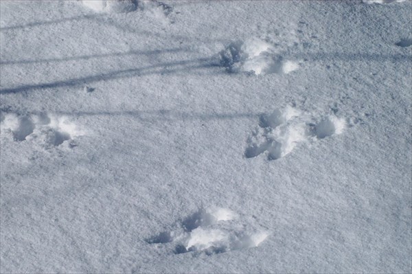 生きものの形跡もたくさん見られました。これはノウサギの足跡です。雪面にあいた穴は3つ。