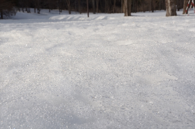 太陽に照らされた雪面が、とけた綿菓子のようにキラキラしていました。歩くとシャーベットみたいにシャクシャクします。