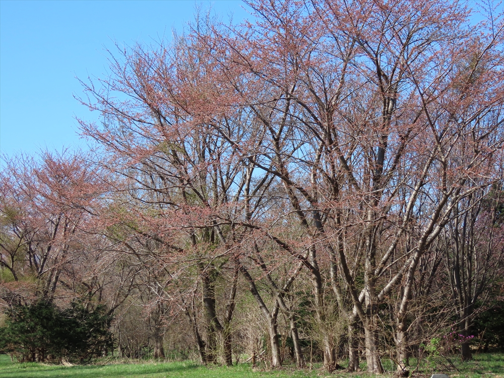 今日の開花状態は、日当たりの良い場所にあるエゾヤマザクラ数本が八分咲きでした。