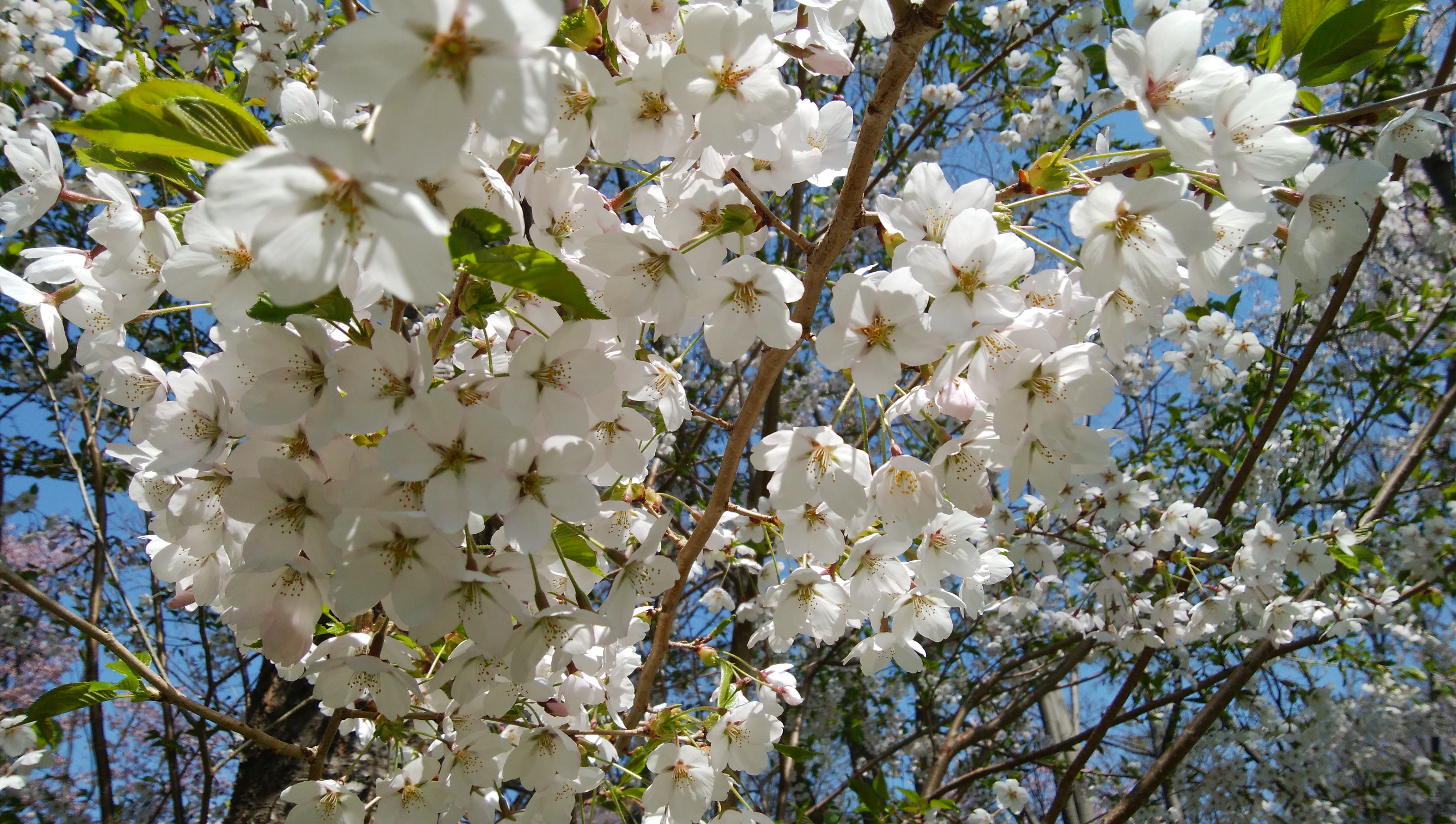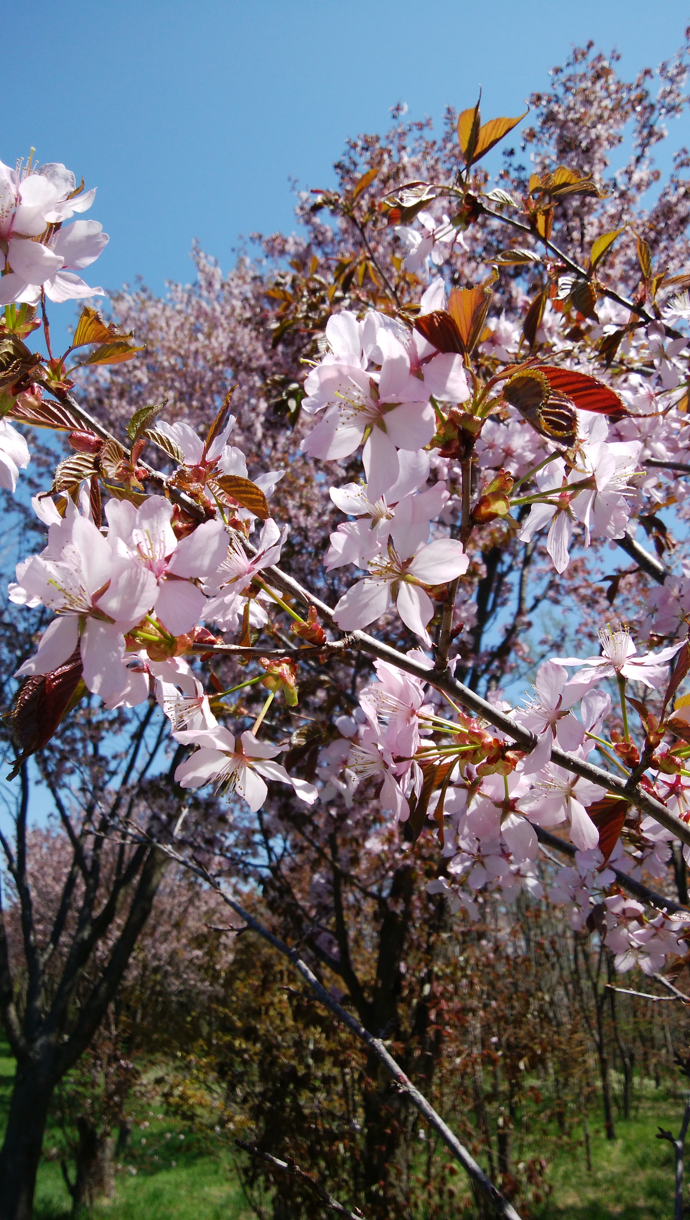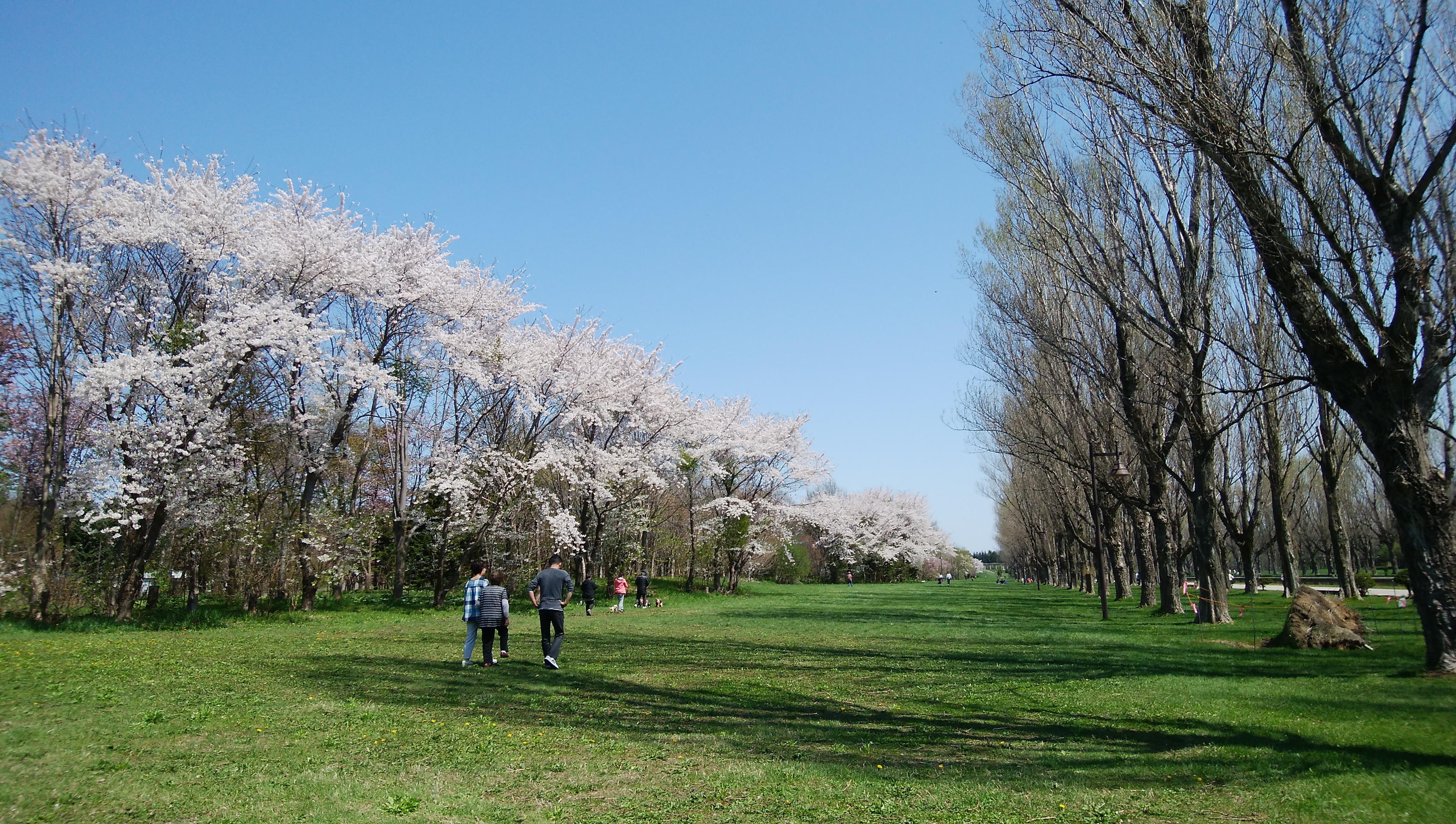 ゴールデンウィーク後半。園内のサクラの開花状況をお知らせします。 エゾヤマザクラは満開から盛りを過ぎたものが半々くらいですが、ゴールデンウィーク中は楽しめそうです。 満開のエゾヤマザクラを見ながら「葉が出てるのでもう桜も終わりねぇ……」とおっしゃってる方がいらっしゃいましたが、エゾヤマザクラは開花と葉の成長が同時ですので、まだまだきれいな状態を楽しんで頂けると思います。ちなみに、花の終わりに葉が大きくなるのはソメイヨシノです。この写真はエゾヤマザクラ。 それから、カナール横のソメイヨシノの並木が真っ盛りです。 ゴールデンウィーク中はきれいな状態でご覧いただけそうです。 展望ラウンジからの手稲山を望む景色も春めいています。 お天気の良い日はぜひ散策におこしください。