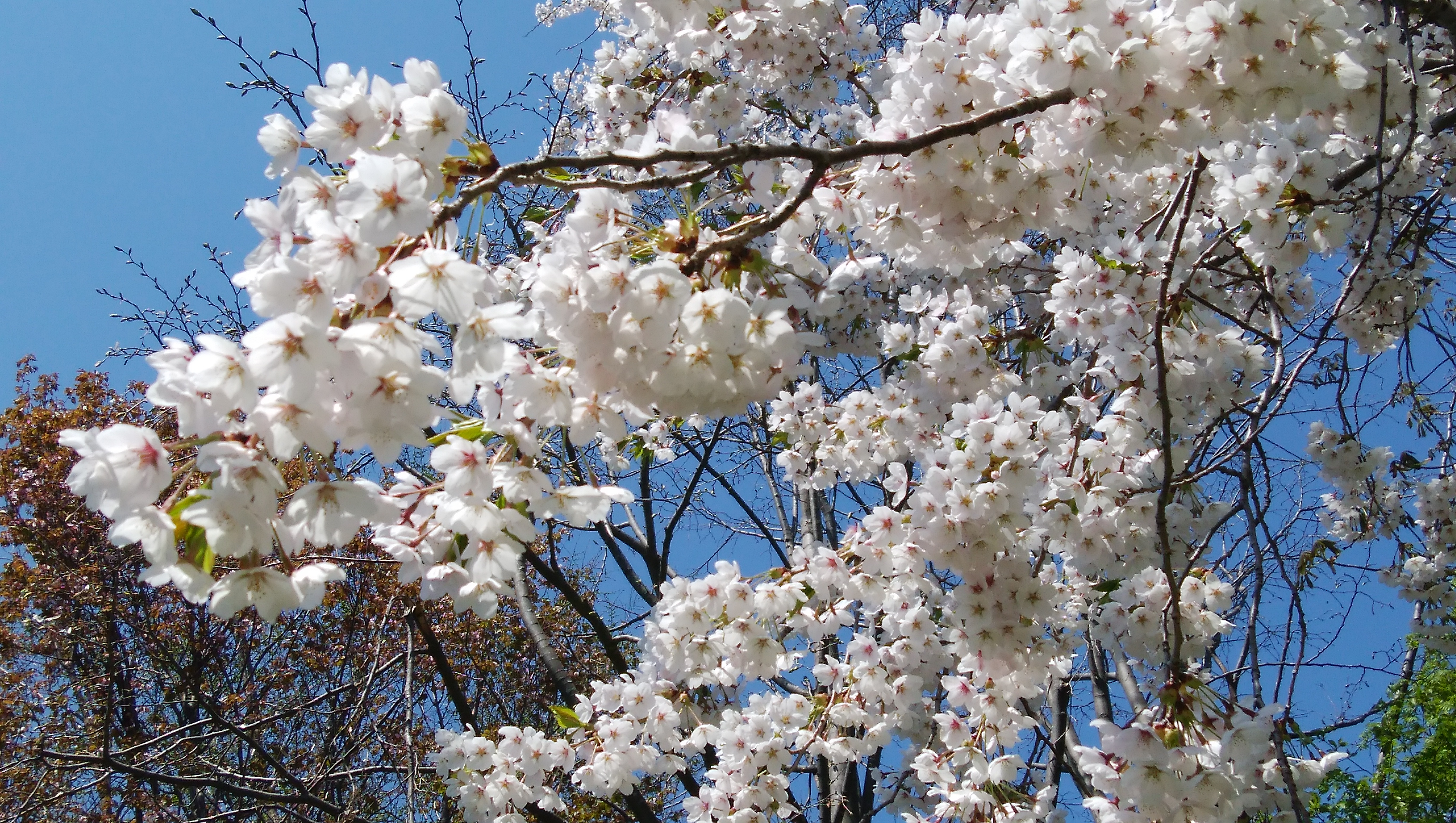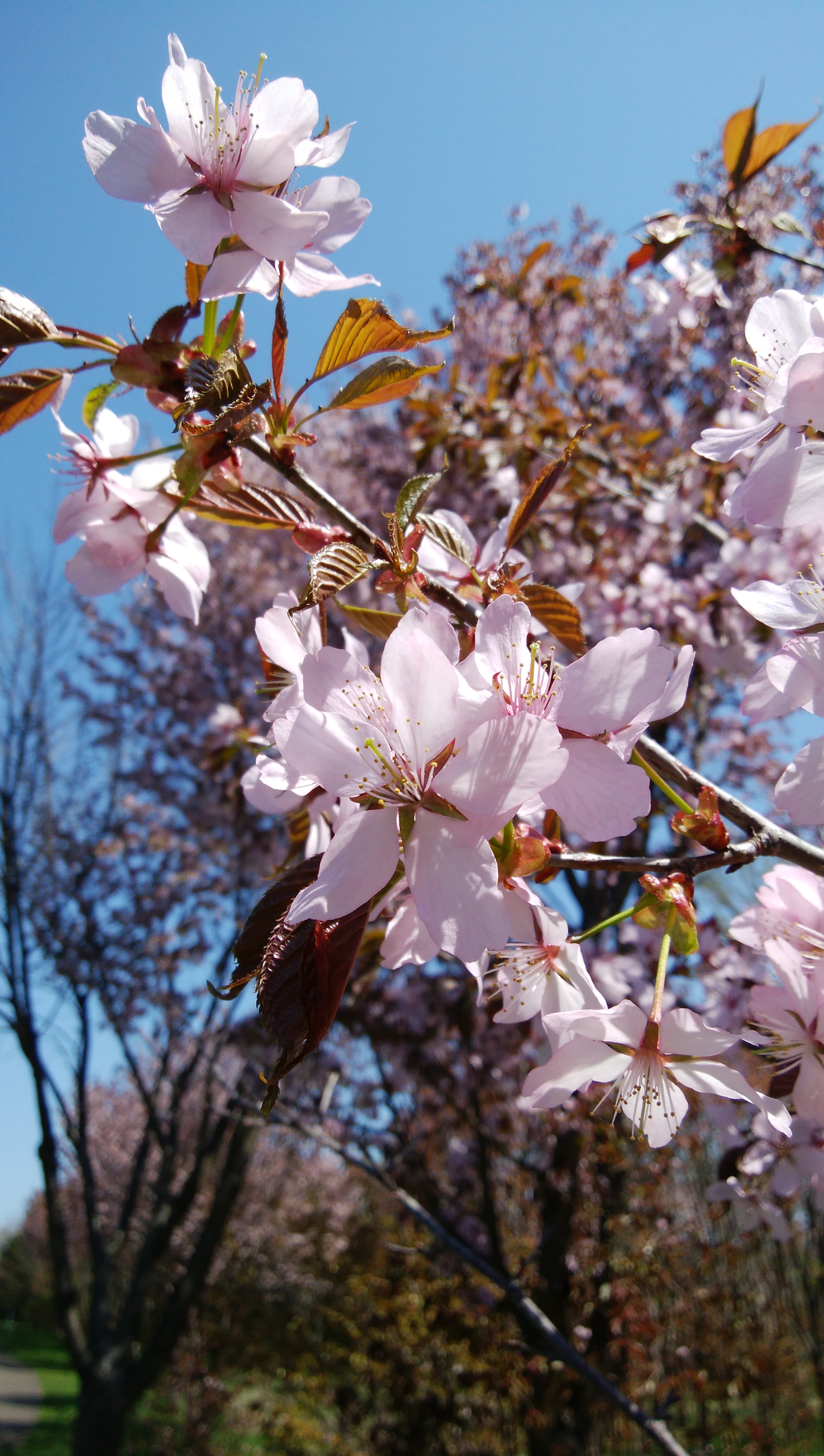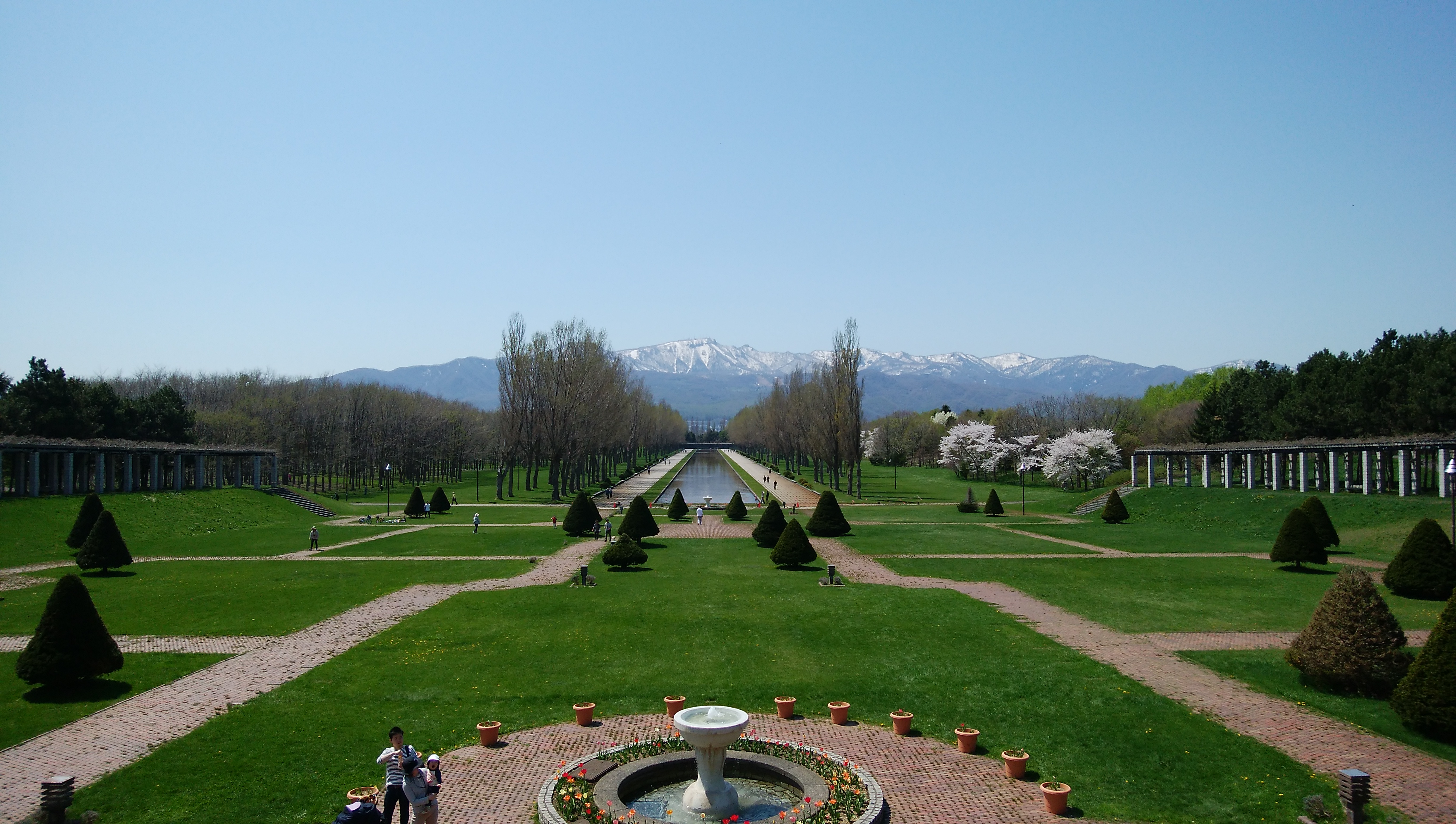 ゴールデンウィーク後半。園内のサクラの開花状況をお知らせします。 エゾヤマザクラは満開から盛りを過ぎたものが半々くらいですが、ゴールデンウィーク中は楽しめそうです。 満開のエゾヤマザクラを見ながら「葉が出てるのでもう桜も終わりねぇ……」とおっしゃってる方がいらっしゃいましたが、エゾヤマザクラは開花と葉の成長が同時ですので、まだまだきれいな状態を楽しんで頂けると思います。ちなみに、花の終わりに葉が大きくなるのはソメイヨシノです。この写真はエゾヤマザクラ。 それから、カナール横のソメイヨシノの並木が真っ盛りです。 ゴールデンウィーク中はきれいな状態でご覧いただけそうです。 展望ラウンジからの手稲山を望む景色も春めいています。 お天気の良い日はぜひ散策におこしください。