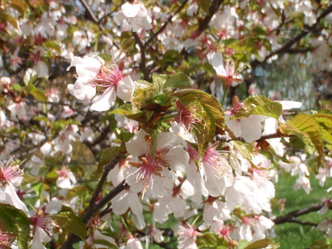 花木園に1本あるカスミザクラは遠くからでも花びらが白く見え、手稲山をバックに良い眺めです。