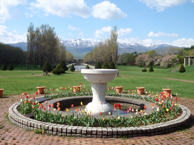 サンクガーデンの噴水まわりの花壇のチューリップが満開です。