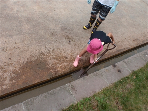 参加してくれた小学校1年生の女の子も、重いスコップを持ってがんばる!かわいいピンクの長靴がドロドロになるまで、一生懸命作業をしてくれました。