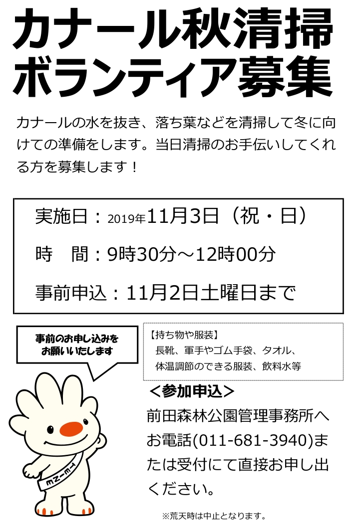 ひと雨ごとに寒くなり、紅葉が進んでいきますが カナール両脇のポプラの黄葉は、今年少々遅いようです。 前田森林公園のカナールは、毎年「秋のカナール清掃」を行っております。例年ボランティアの皆様にご協力いただき、冬に向けての準備をします。 今年も、清掃をお手伝いしてくださる方を募集いたします。 開催日:11月3日祝日の9時30分から12時まで 事前申込:11月2日土曜日まで お時間がございましたら、ご協力の程よろしくお願いいたします。