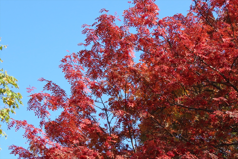 ナナカマドも、一部が写真のように真っ赤になっていますが、葉自体の紅葉はまだ半分以下です。