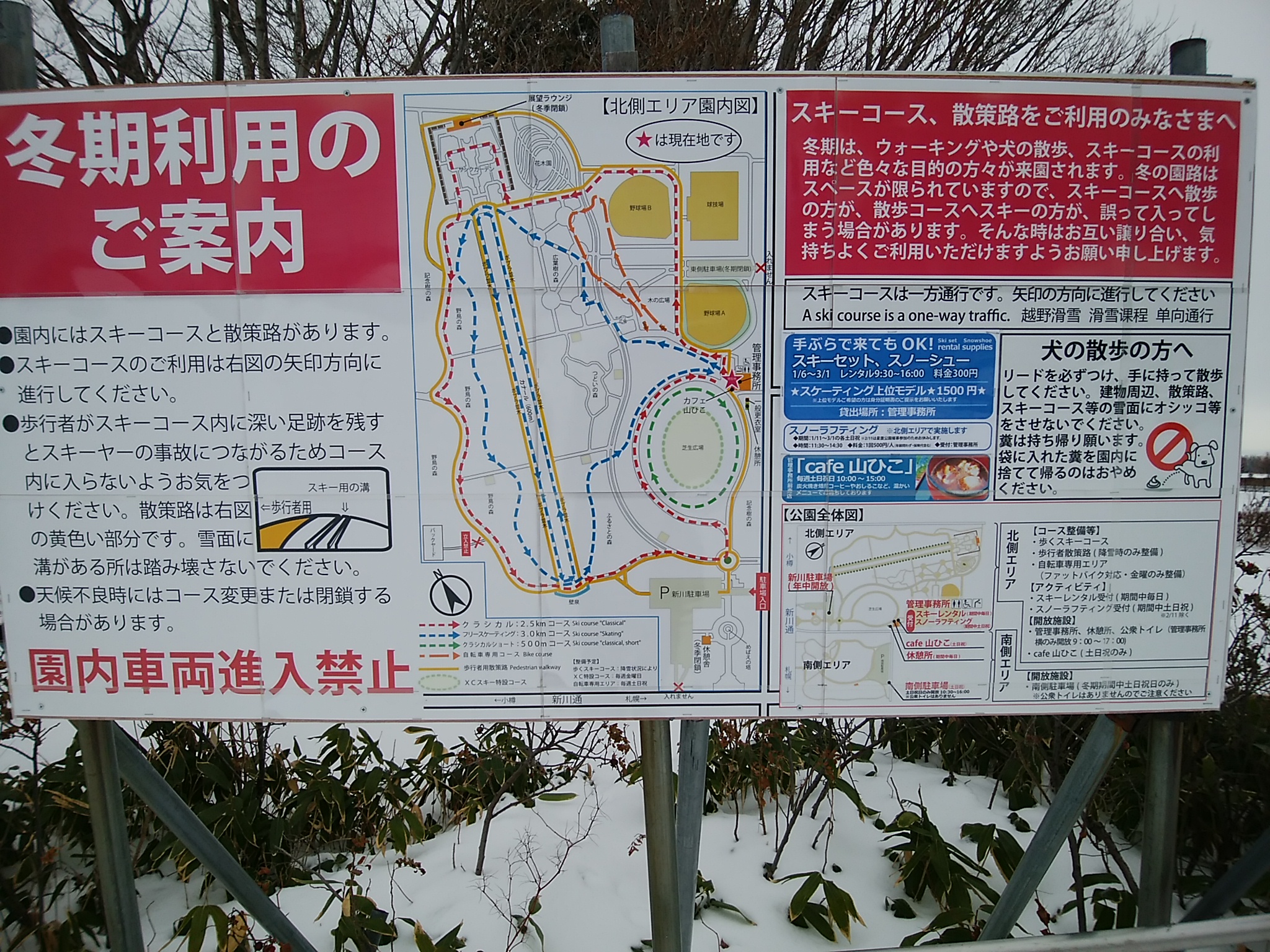 園内は、クラシカル(歩くスキー)コース、スケーティングコース、散策用散歩道の3種を圧雪やカッター切などで整えております。各コースを明記した大きな看板を要所要所に立てておりますので、ご確認いただけましたら幸いです。