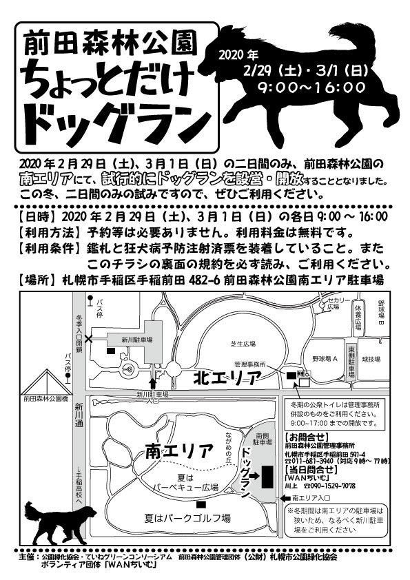 2020年2月29日土曜日、3月1日日曜日の二日間のみ、前田森林公園の南エリアにて、試行的にドッグランを設営・開放することとなりました。この冬、二日間のみの試みですので、ぜひご利用ください。ご利用の前に、以下の「前田森林公園ドッグラン利用規約」を必ずご確認ください。
