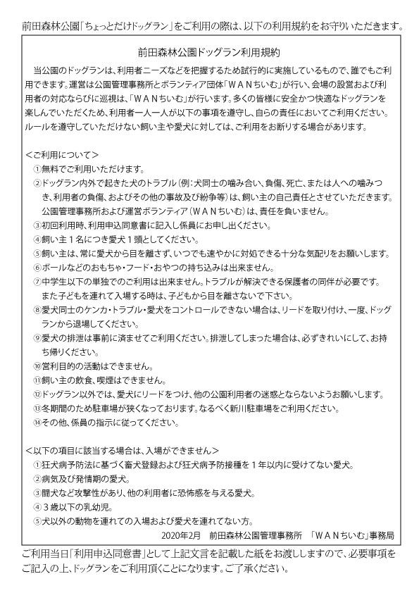 (2)ドッグラン内外で起きた犬のトラブル(例:犬同士の噛み合い、負傷、死亡、または人への噛みつき、利用者の負傷、およびその他の事故及び紛争等)は、飼い主の自己責任とさせていただきます。公園管理事務所および運営ボランティア(WANちいむ)は、責任を負いません。