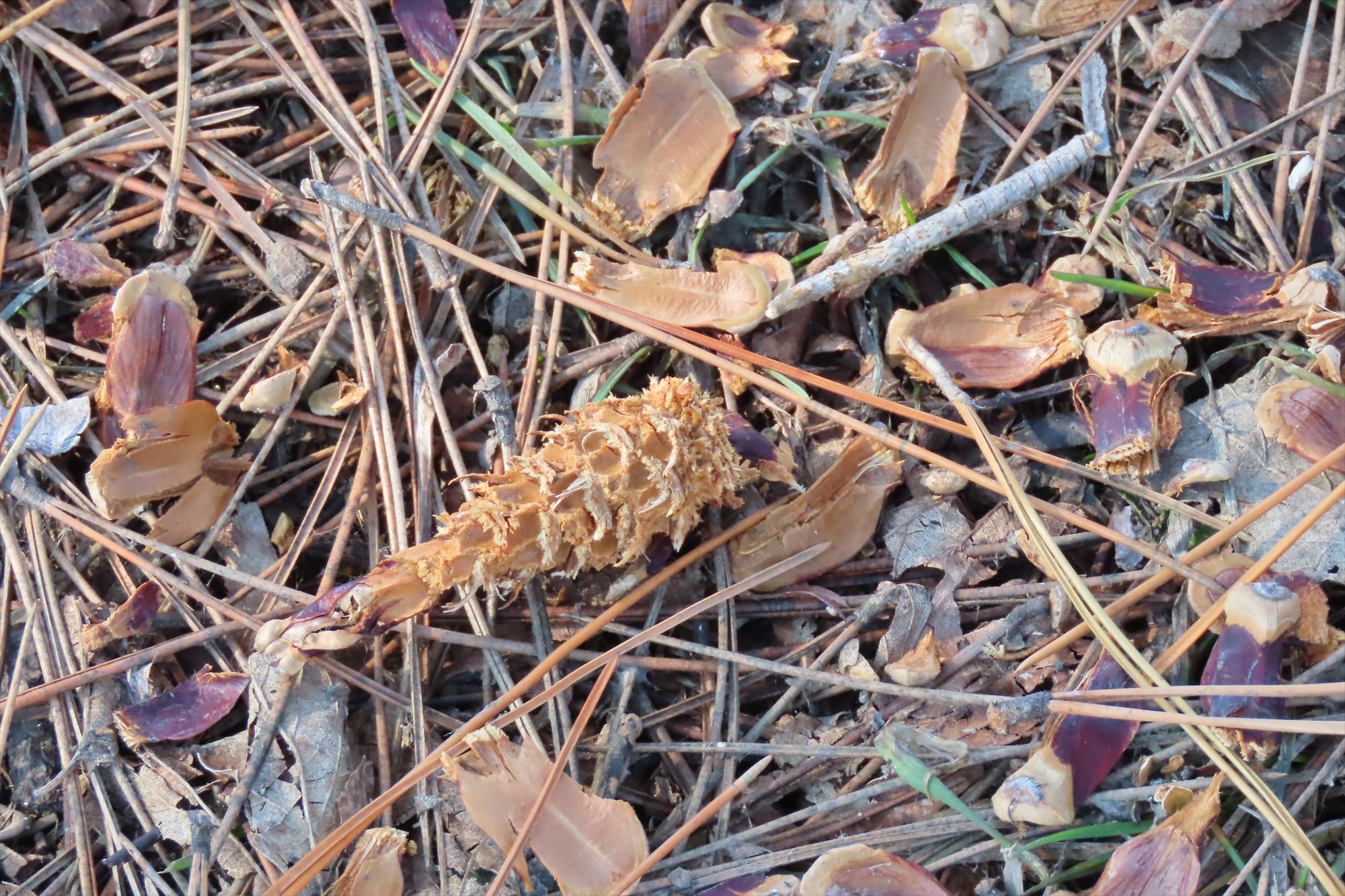 エゾリスたちも園内を走り回っています。これはエゾリスが食べ終わった松ぼっくりの写真。よく「エビフライ」といわれてます。