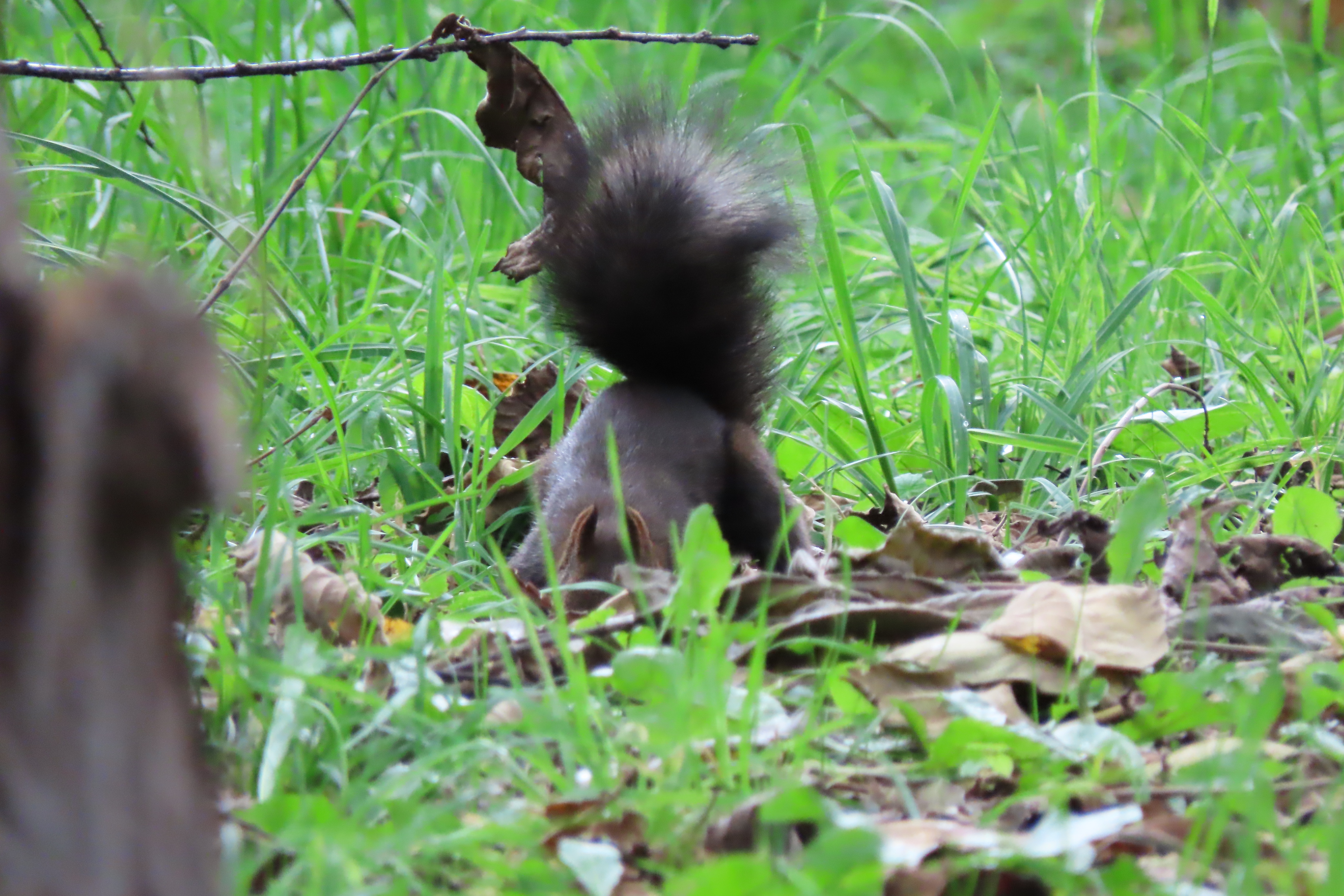 草むらでエゾリスのしっぽがふさふさ揺れています。