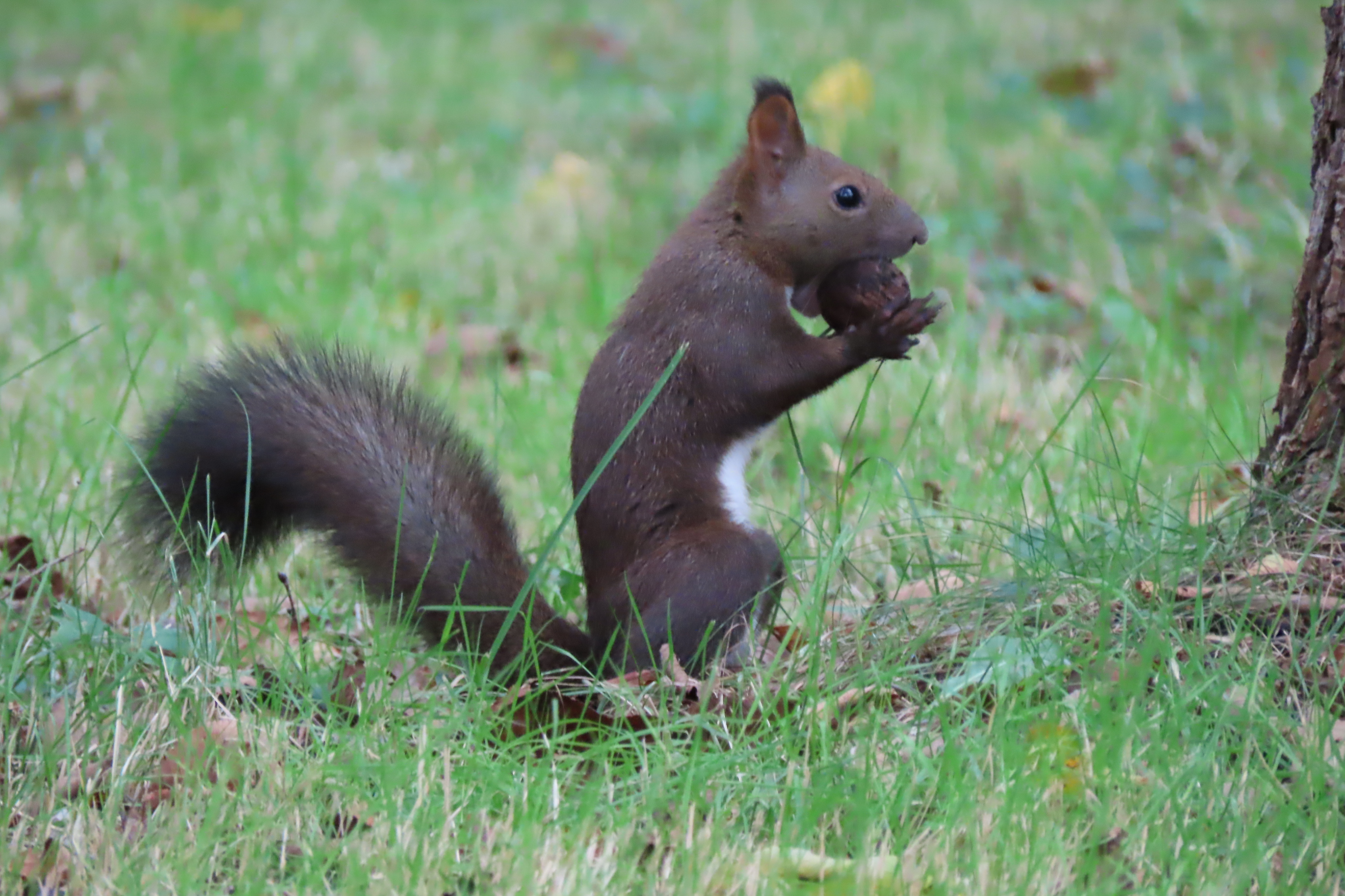 拾ったオニクルミをどこに隠すか悩んでいるのか、くわえたままあちこち走り回っています。