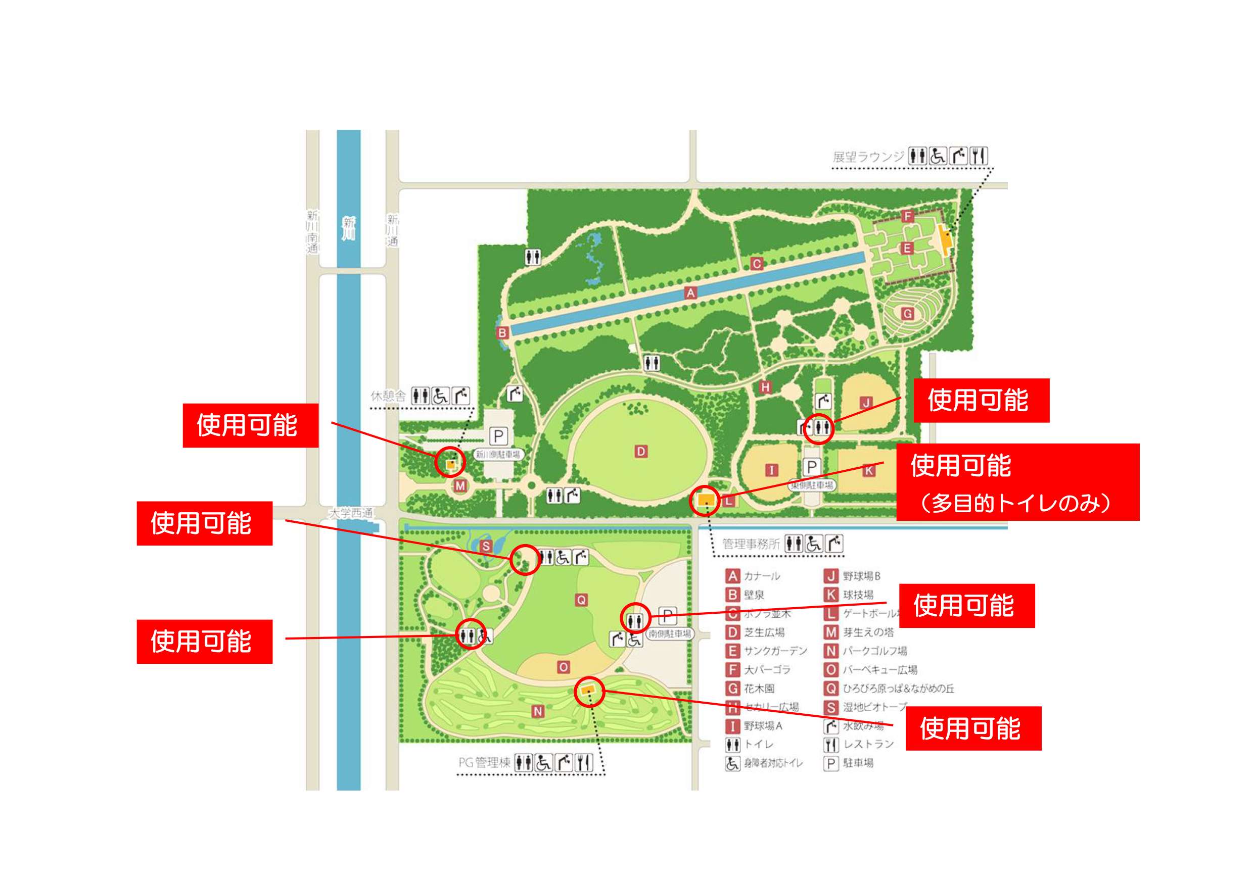 ■管理事務所の男子トイレ・女子トイレ 10月15日~19日 使用不可 →隣接する多目的トイレまたは屋外公衆トイレをご利用ください。 ■同上多目的トイレ 10月23日 使用不可 →隣接する男子・女子トイレまたは屋外公衆トイレをご利用ください。 10月15日 一時使用不可 →屋外公衆トイレをご利用ください。 ■管理事務所の休憩コーナーの冷水器 10月23日~24日 使用不可 →管理事務所窓口で紙コップにて飲用水(水道水)をご提供いたします。 ■芝生広場の南側のトイレおよび水飲台、展望ラウンジのトイレおよび全ての水道設備 10月16日 16:00~18:00 使用不可 →下図の施設をご利用ください。![]()