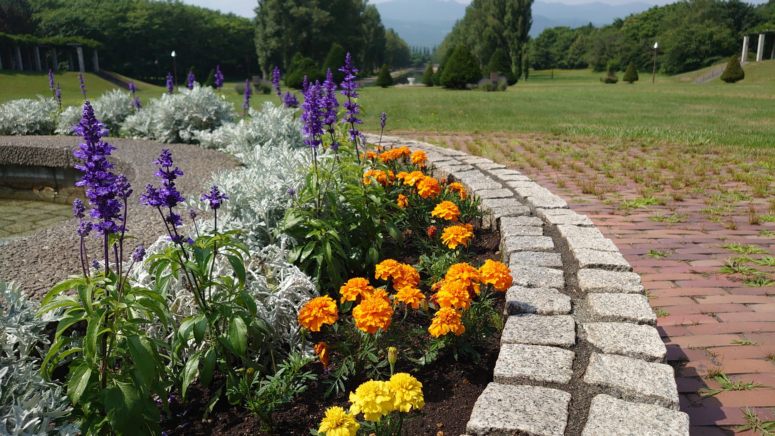 先日のボランティア活動時に、サンクガーデンの噴水花壇の植替えを行いました。
