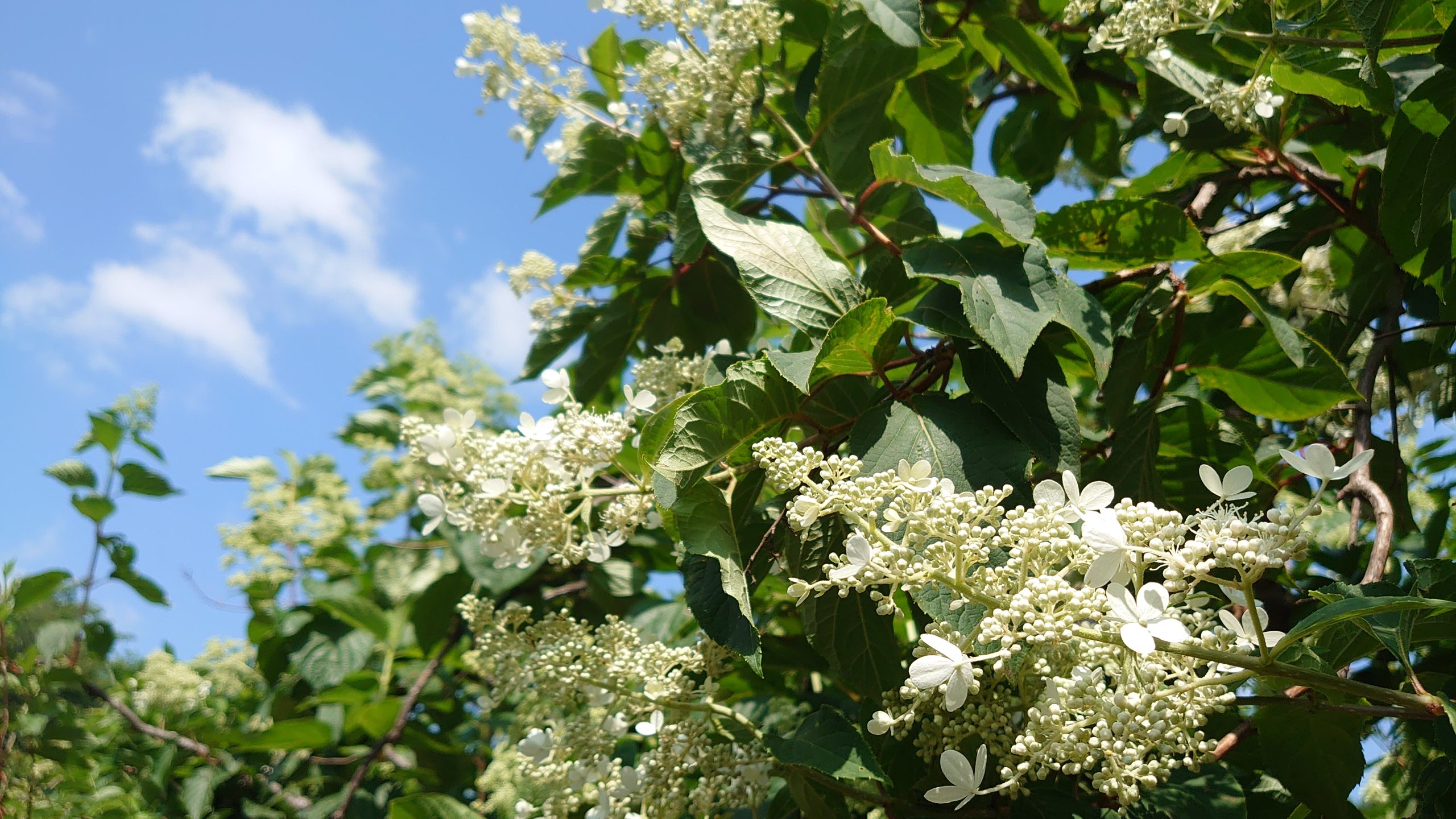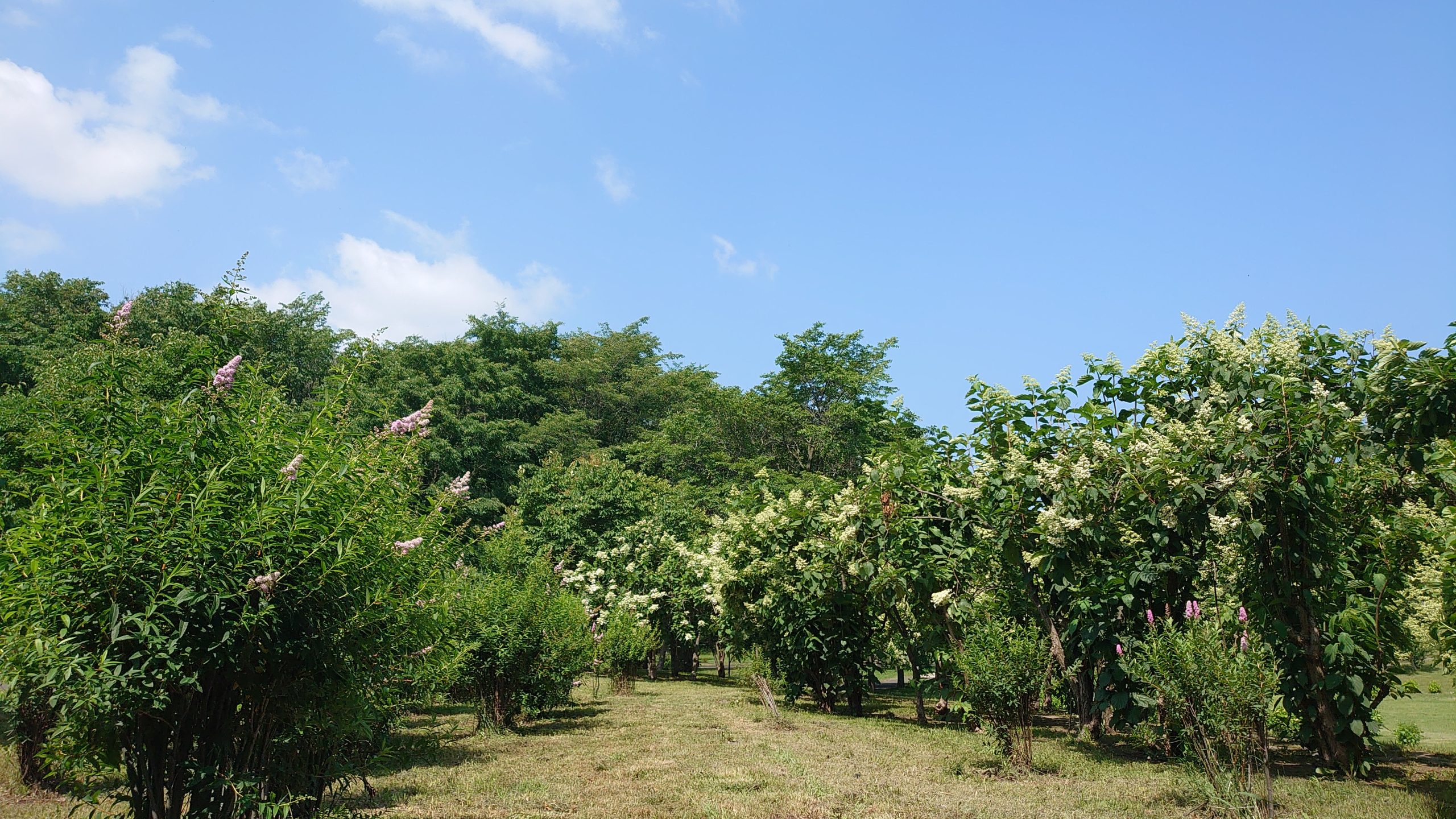 サンクガーデンの隣の花木園では、ホザキシモツケとノリウツギが見頃を迎えております。