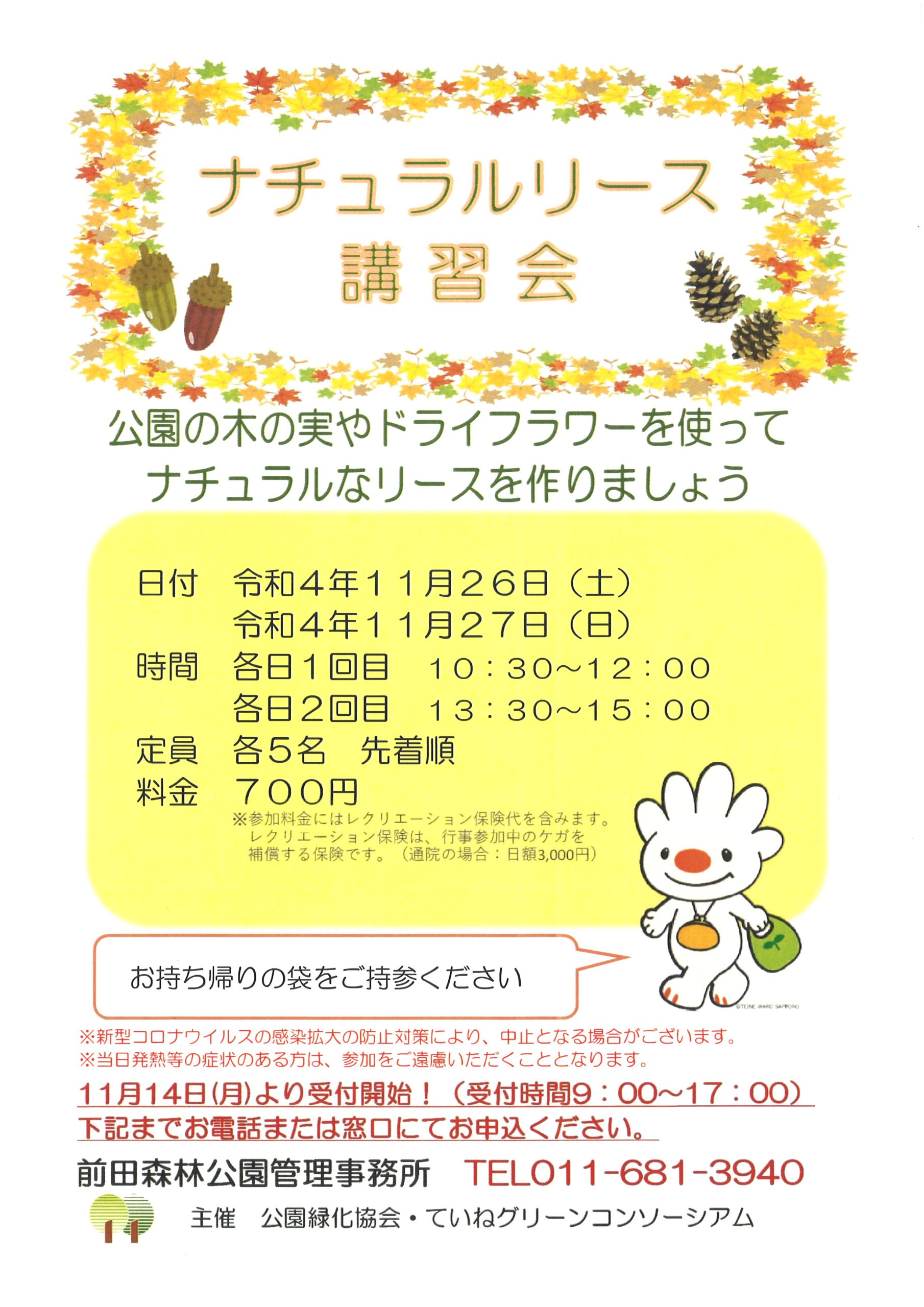 ナチュラルリース作りに変更となりました。前田森林公園の園内には豊富な種類の木の実がありますので、ぜひ世界に一つだけのリースを作ってみてはいかがでしょうか。