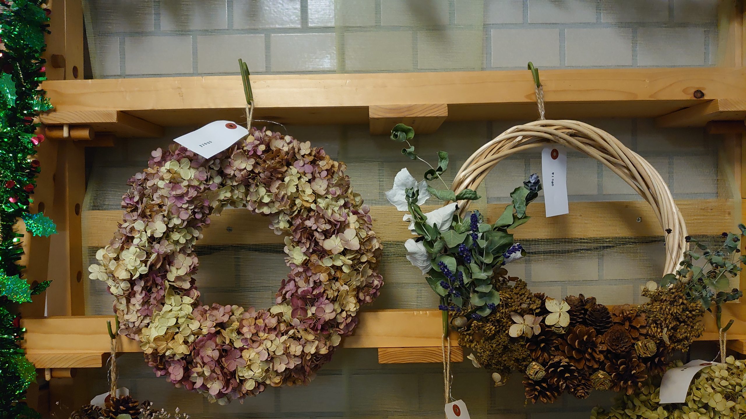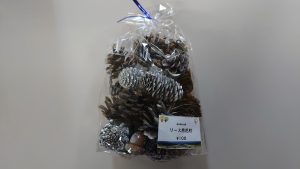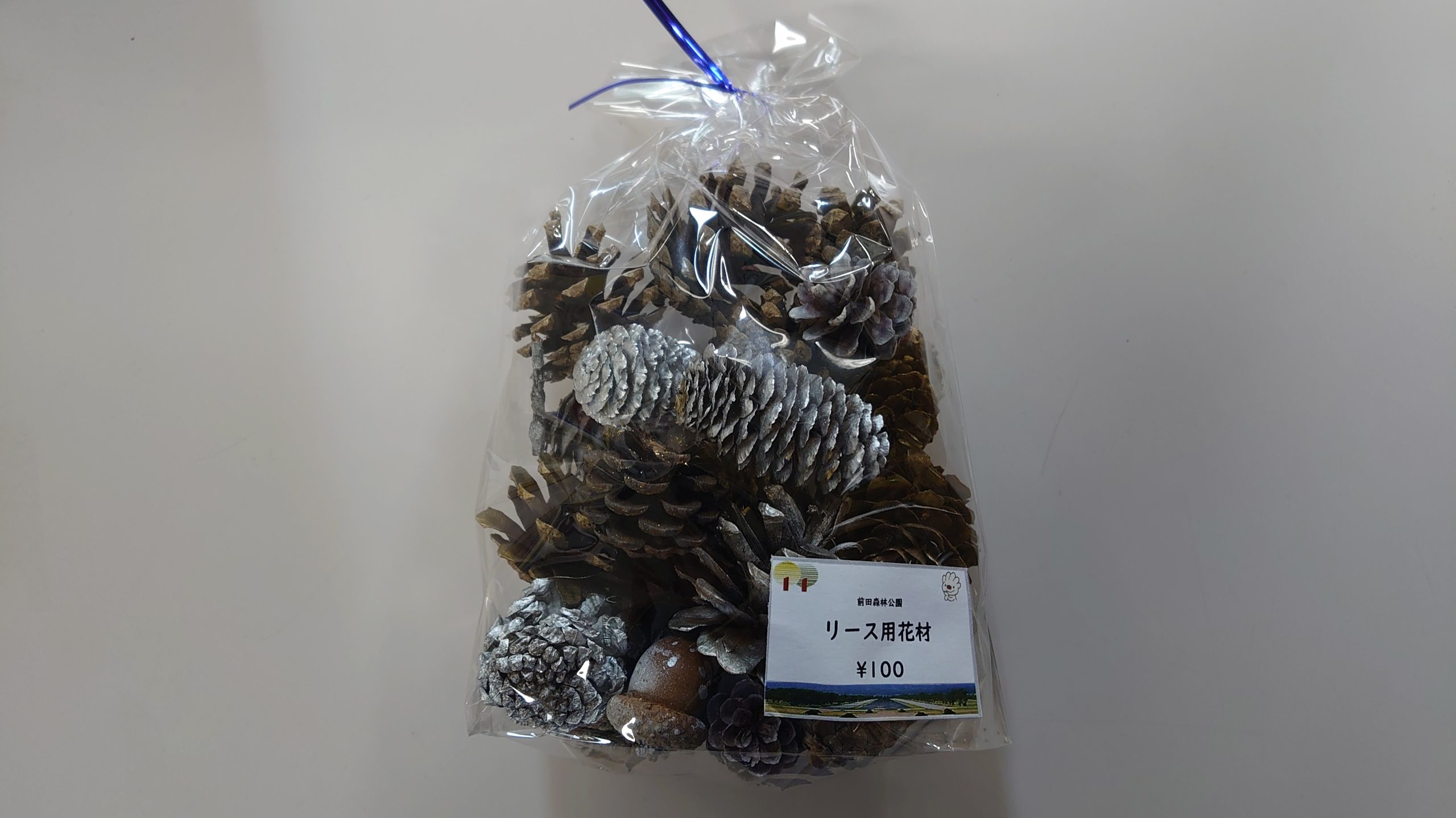 明日2日(金曜日)より管理事務所受付にてリース及びクラフト資材を販売いたします。 こちらの花材は100円で販売。(スターチス、カイザイクの袋詰め) そしてこちらは、オオウバユリを細工した花材の詰合せは200円にて販売いたします。 松ぼっくりの詰合せは100円です。 また、完成品のリースも販売いたします。価格は1000円から2000円です。 なお、花材、リースついては数に限りがございますのでご了承ください。 こちらにお越しの機会がありましたら、ぜひ管理事務所にお立ち寄りください。