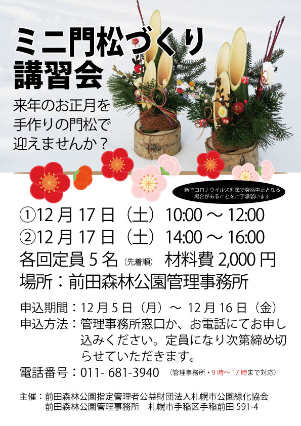 本日より、毎年人気のミニ門松づくり講習会申込を開始いたします。