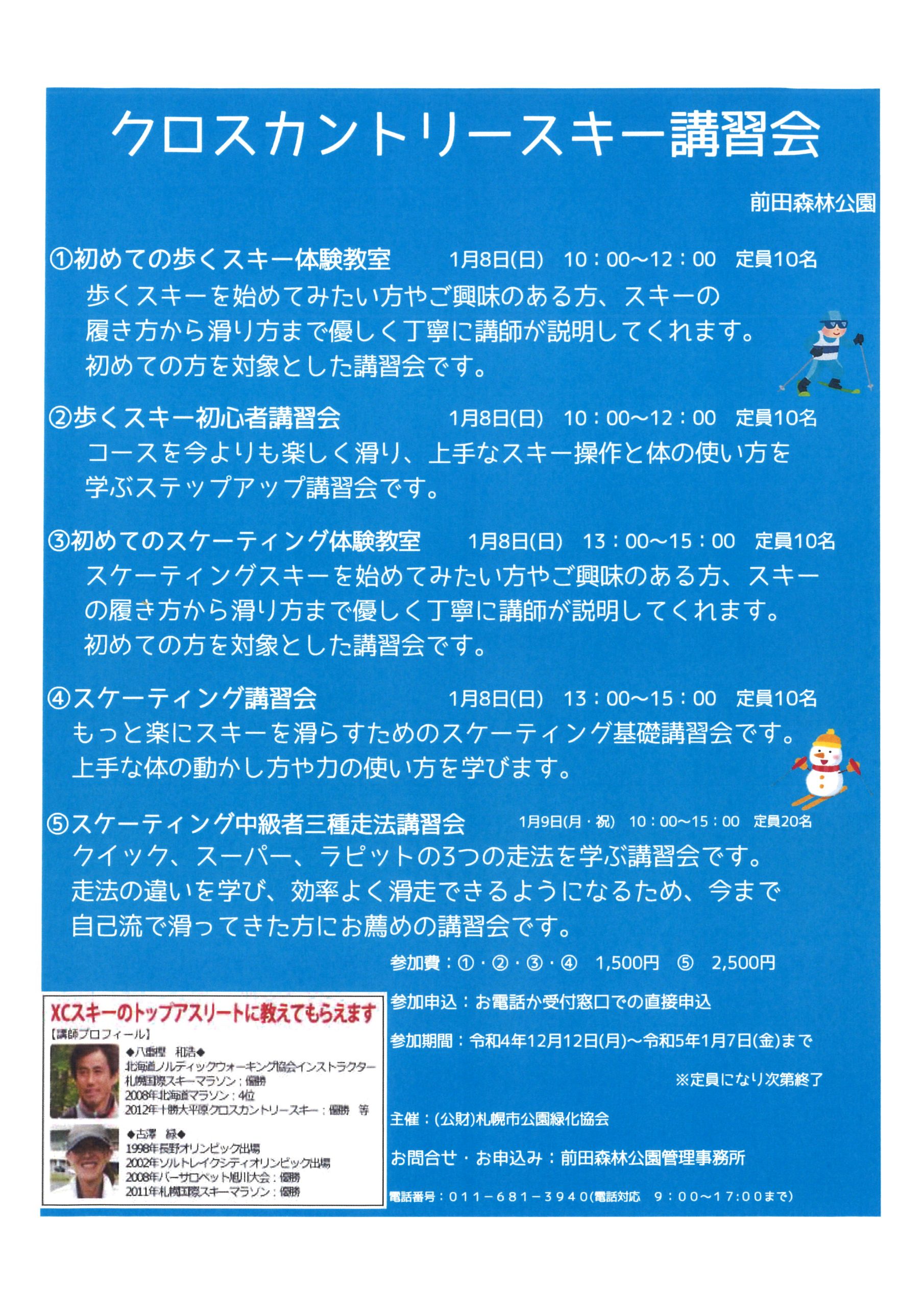 2023年1月より、園内コースを利用したクロスカントリースキーの講習会を開催いたします。今年も元オリンピック選手や大会優勝経験者を講師にお招きし、初めての方から中級者まで、自身の経験や体力に合わせた講習会をご用意いたしました。クロスカントリースキーを始めてみたい方やレベルアップをしたい方は、ぜひこの講習会にご参加ください。