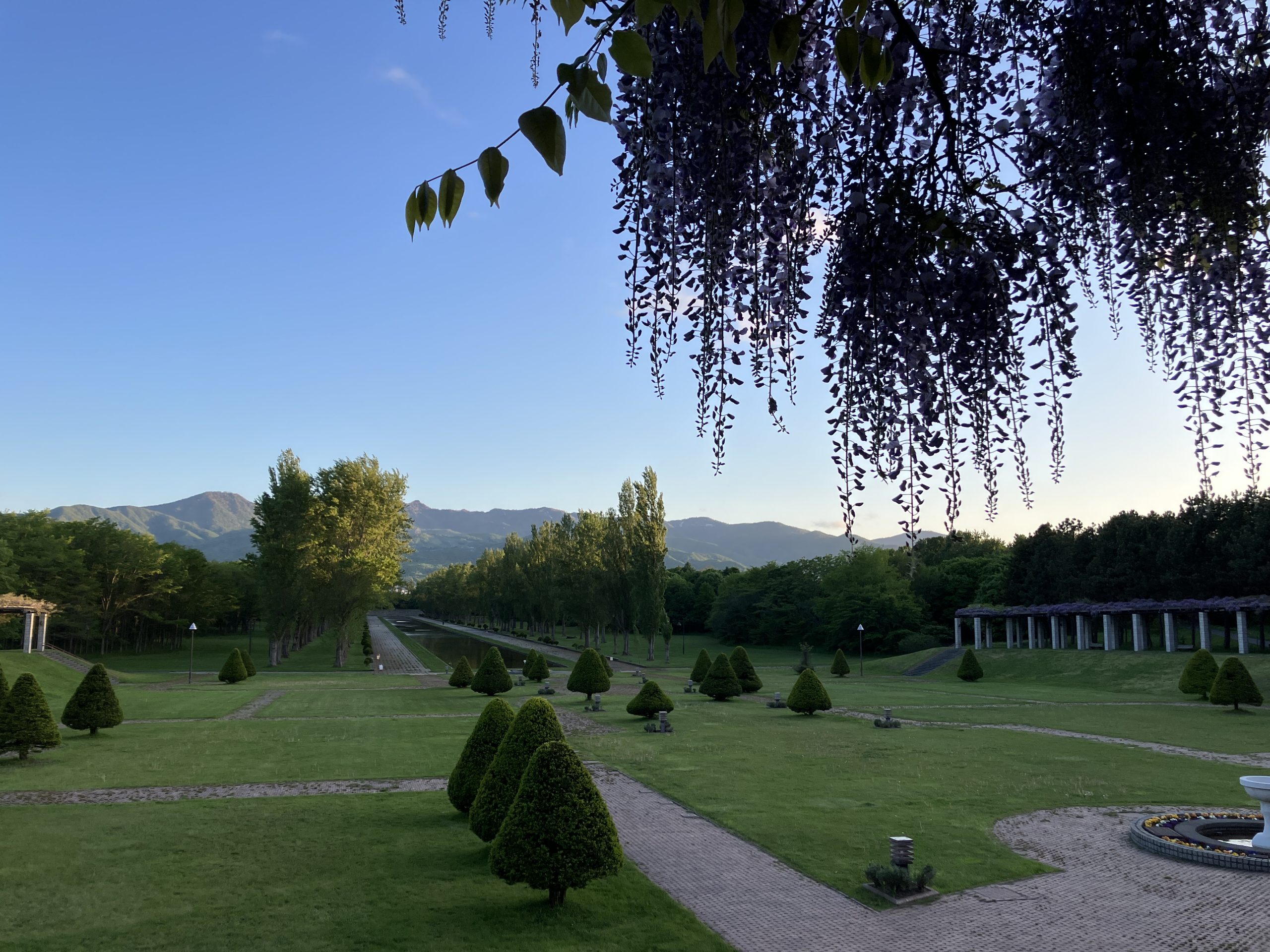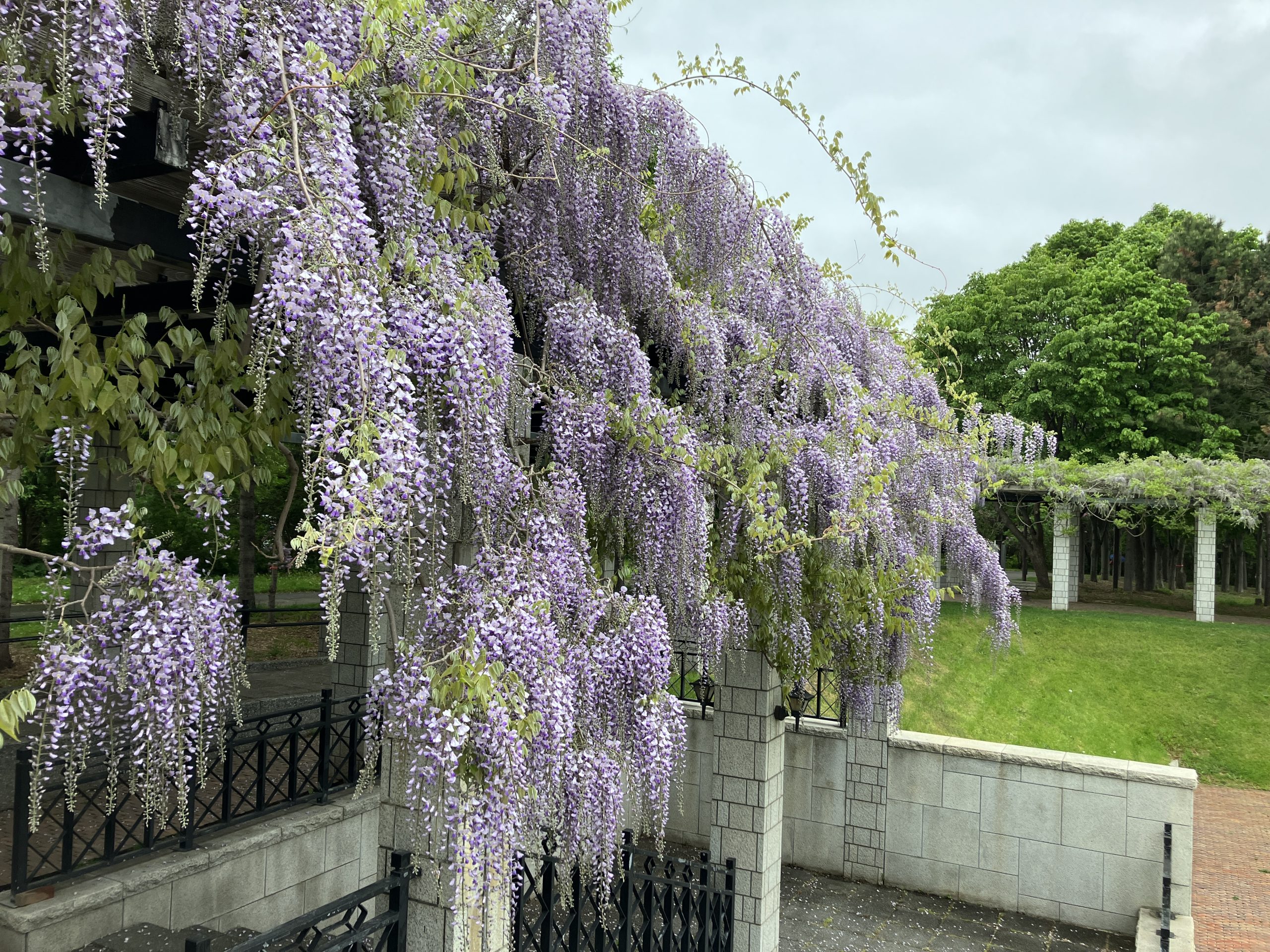 問い合わせが多くなってきたフジの開花状況ですが、はやくから咲いていた箇所についてはかなり見ごたえがでてきており本日もたくさんの方が記念撮影を行っていました。