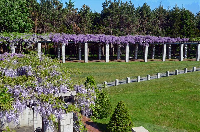 パーゴラ一面に5月下旬から6月初旬にかけて淡紫色または白色の藤の花を咲かせる様は圧巻です。