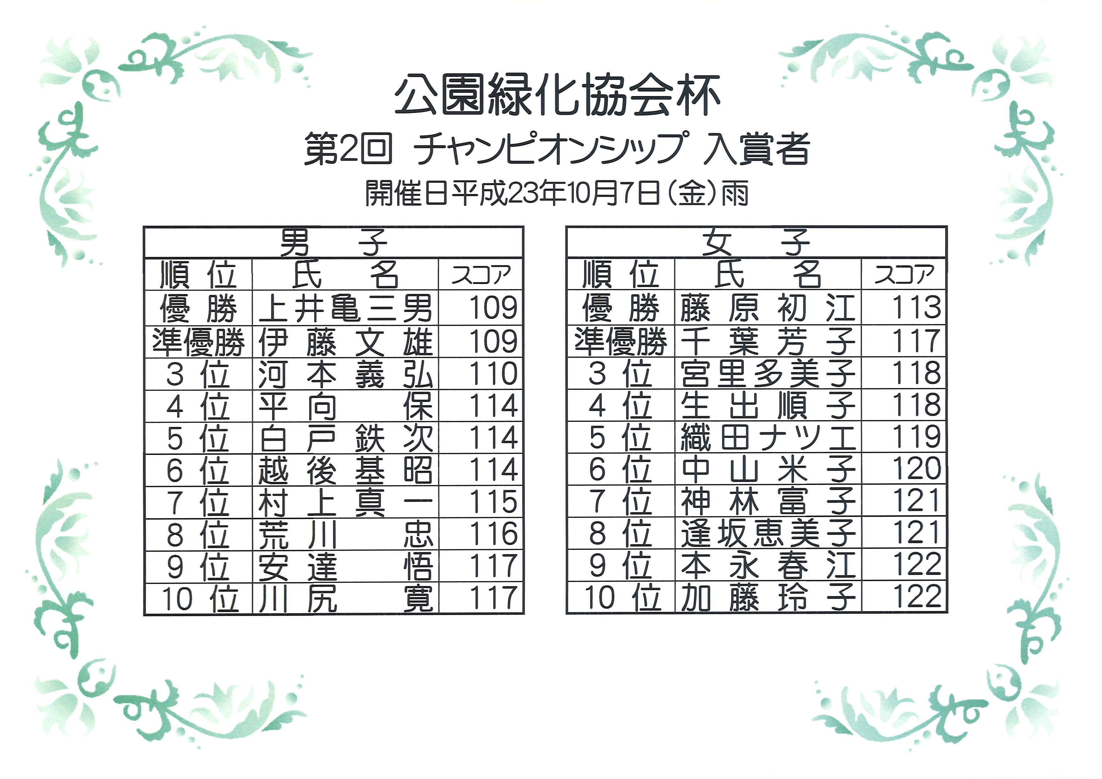 第2回公園緑化協会杯パークゴルフチャンピオンシップの結果発表