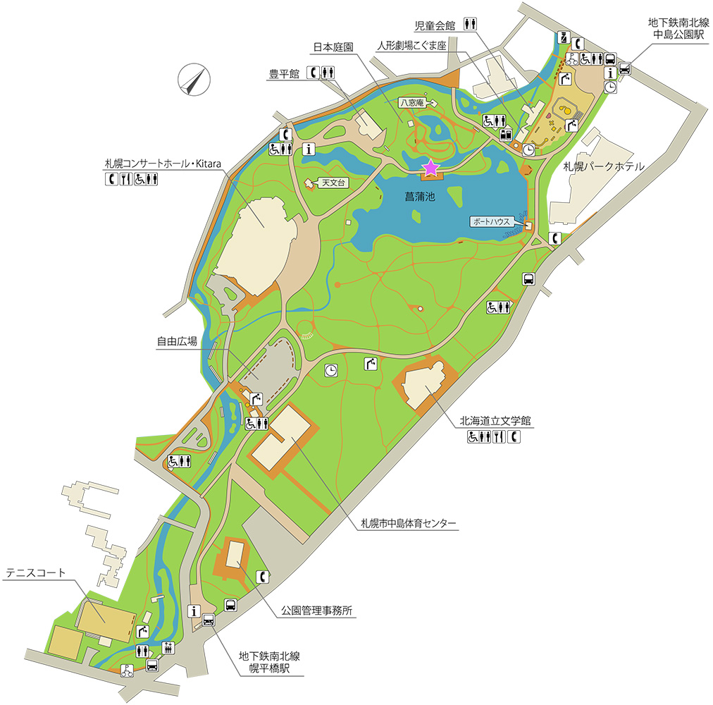 藻岩山を背景に、 水と緑が豊かな憩いの場として親しまれている公園です。