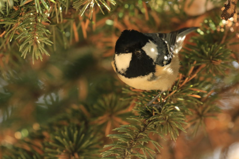 イチイの枝にとまる1匹のシジュウガラ正面