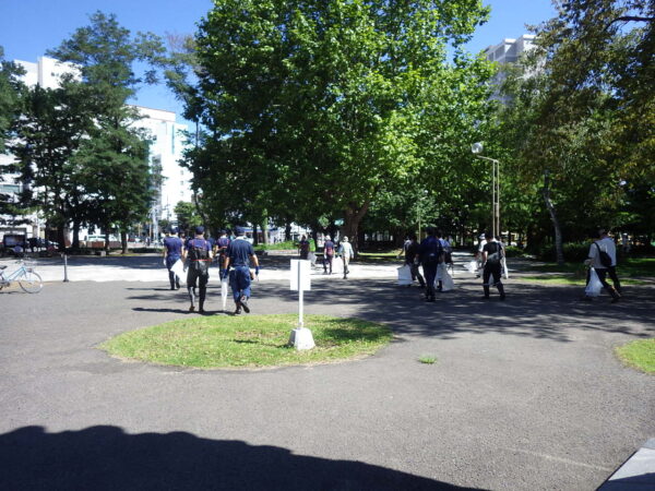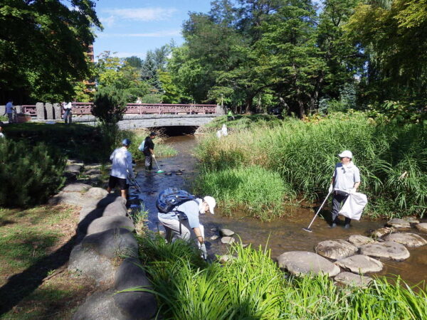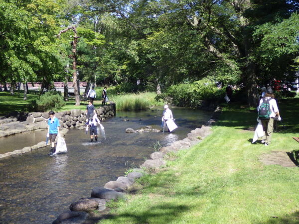 鴨々川の中や川辺のゴミ拾い、川の中の石清掃、すすきのや中島公園の清掃など、各グループに分かれて清掃を行いました。