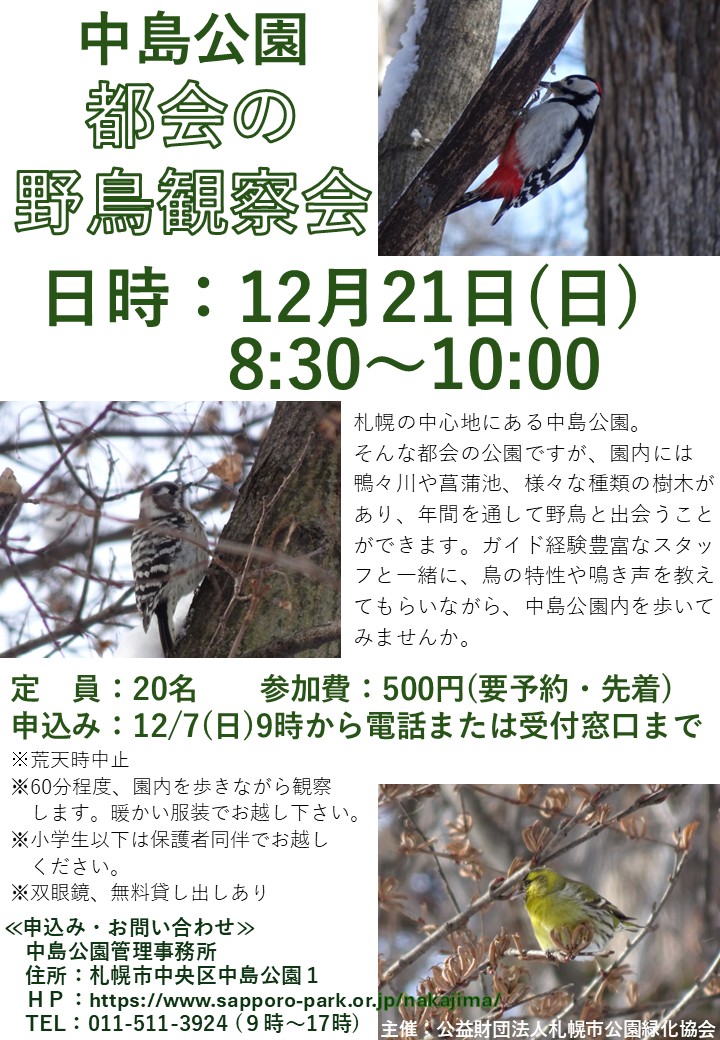 【申し込み】12月7日(日曜日)9時から電話または中島公園管理事務所受付窓口まで
