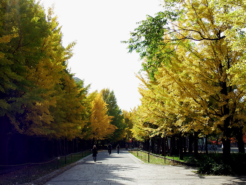眩しいほどの黄色に色づくイチョウ並木は、大正17年に行われた博覧会のあと植栽されたものと言われており、100年近い歴史のある並木です。