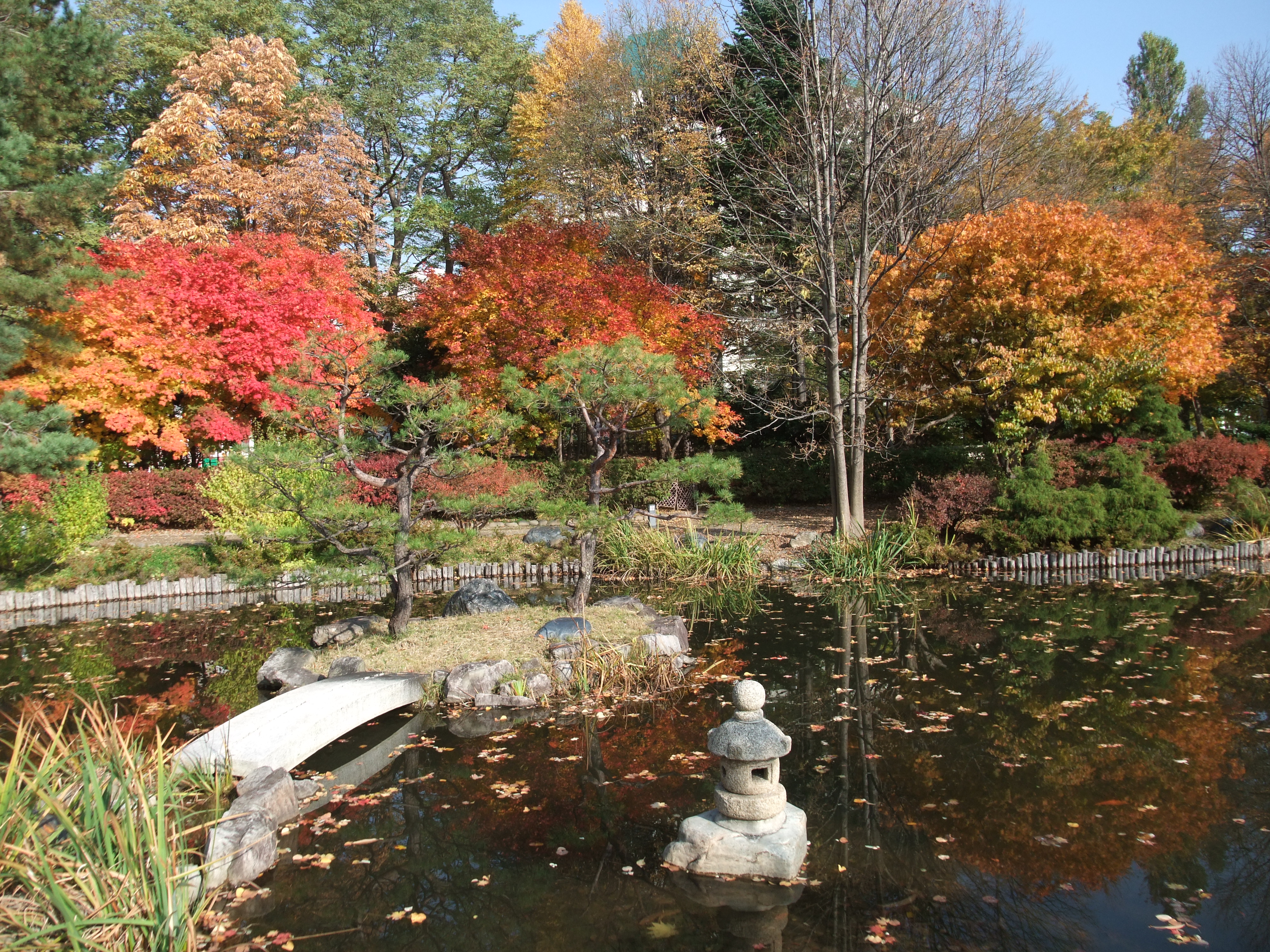 気温が低いせいか、菖蒲池の周辺では他の所より紅葉が進んでいます。