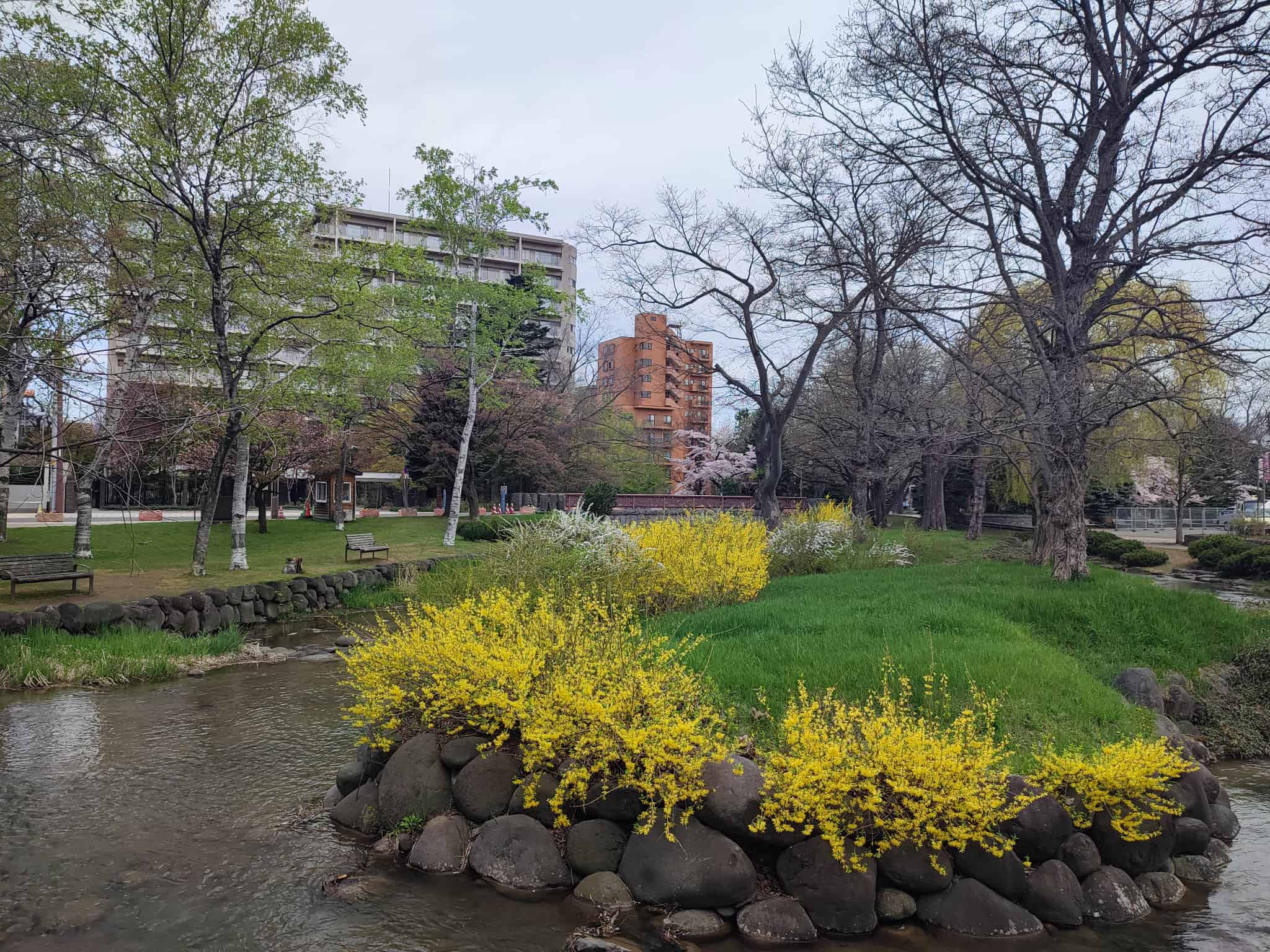 鴨々川とレンギョウとユキヤナギと遠くにサクラ