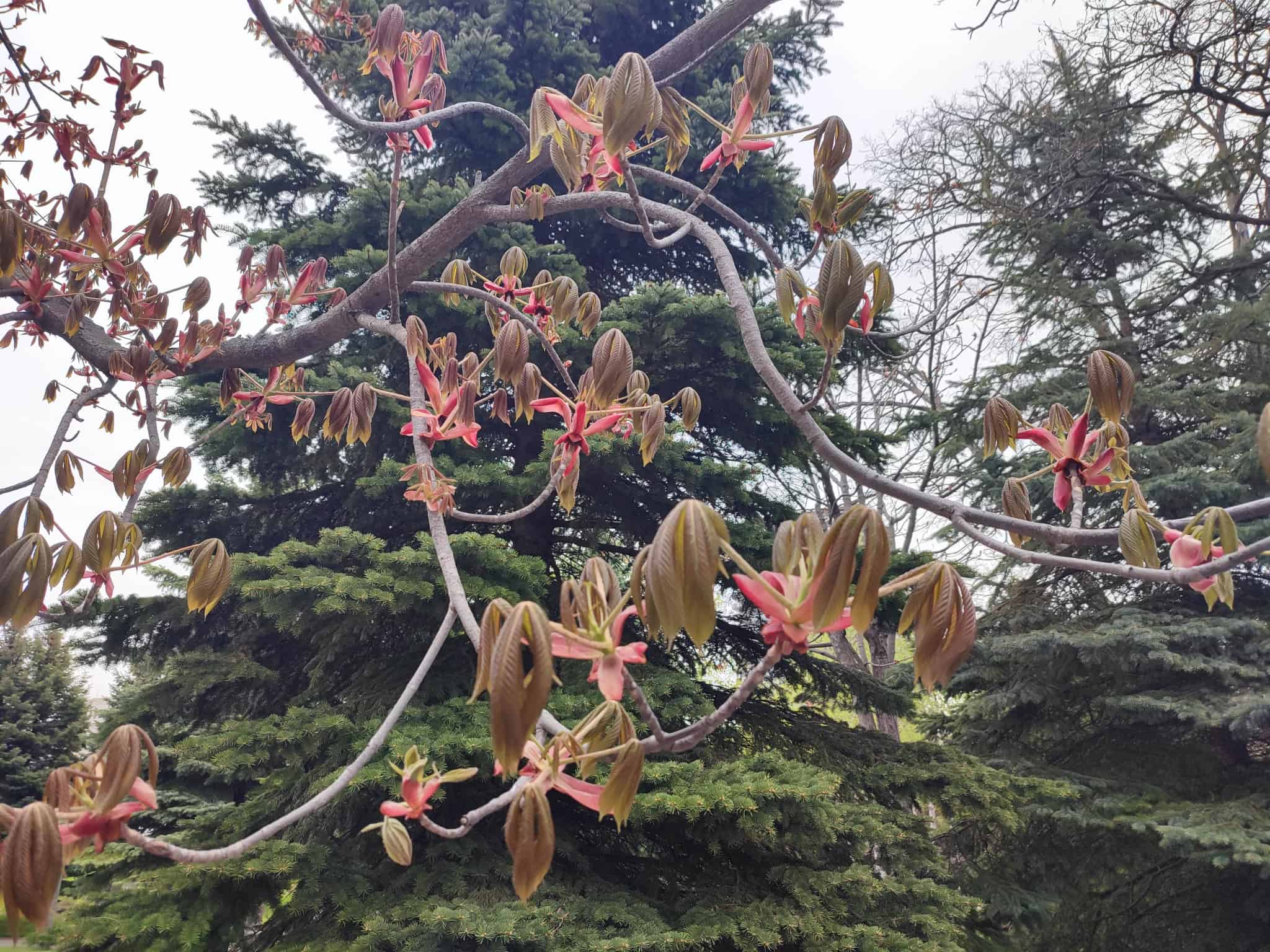 菖蒲池前のエゾヤマザクラとレンギョウ