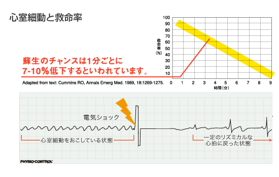 心室細動発生から1分ごとに救命率が7~10%下がるといわれており、いち早く救命処置を行えるかどうかで生死を分けることになります。