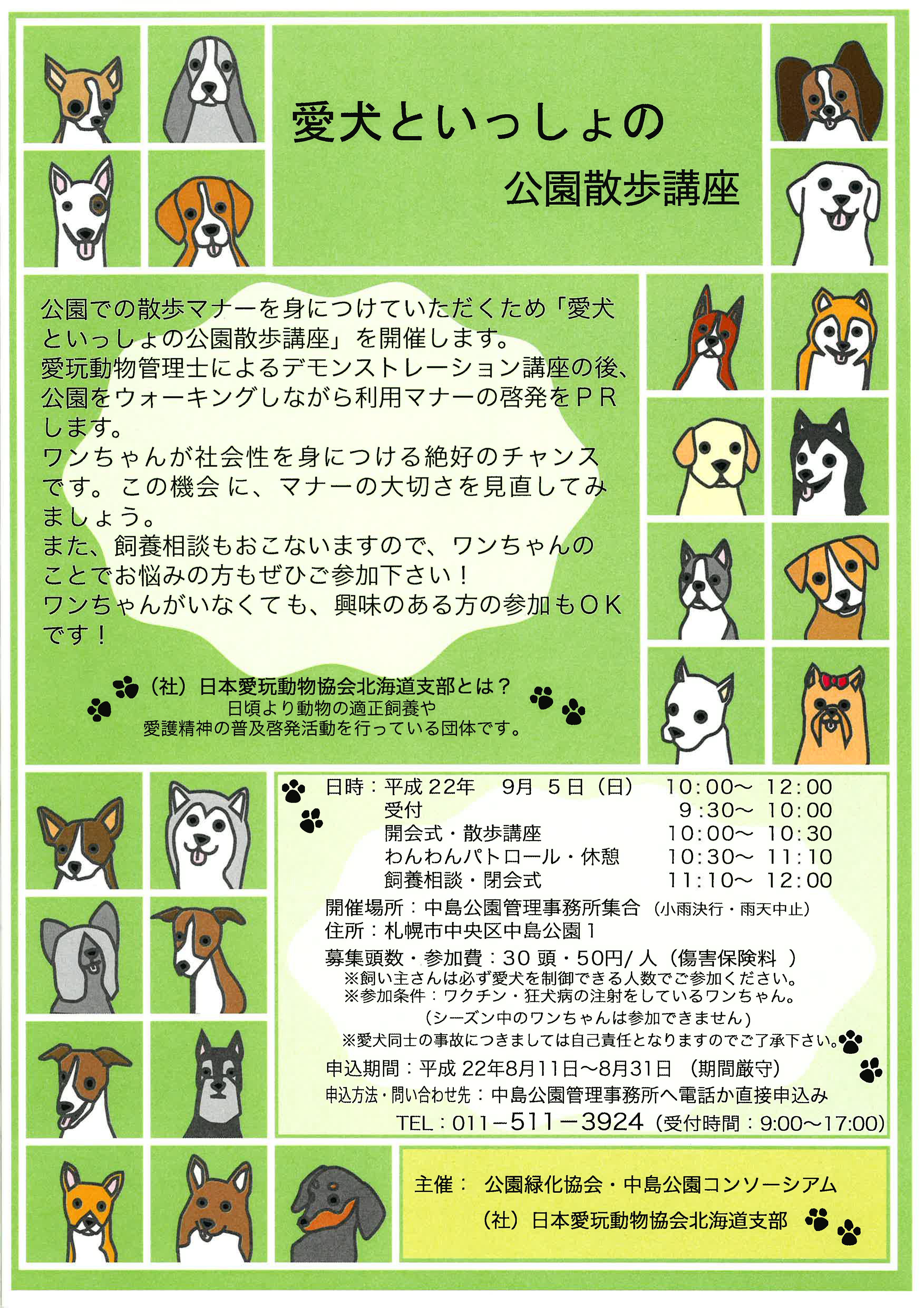 この度、(社)日本愛玩動物協会札幌支部の方々と一緒に「愛犬といっしょの公園散歩講座」を開催することとなりました。