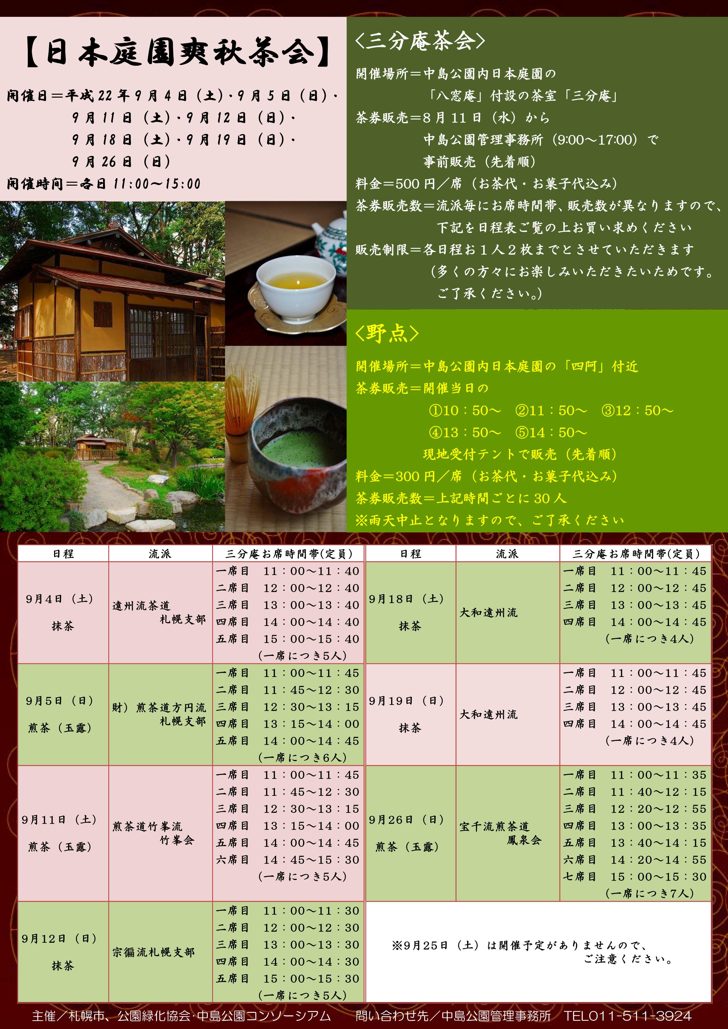 このお茶会は、中島公園の日本庭園内にある「八窓庵」に付設しているお茶室「三分庵」の中でお楽しみいただきます。「三分庵」は一年に一度、このお茶会が催される時のみ開放しますので、このチャンスに是非お茶会にご参加いただき、歴史と趣きを感じながらお茶を楽しんでいただき、優雅なひと時を満喫していただけたらと思います。