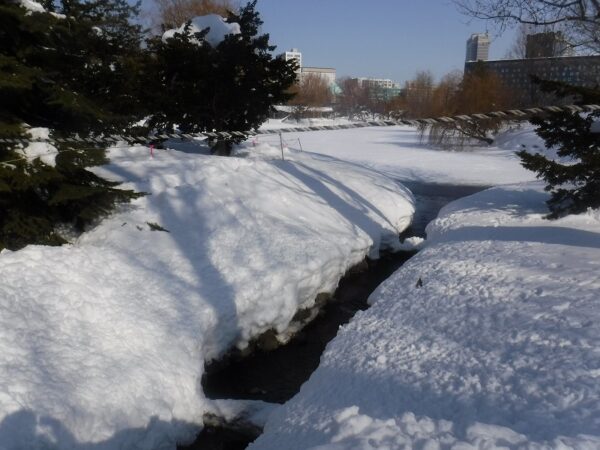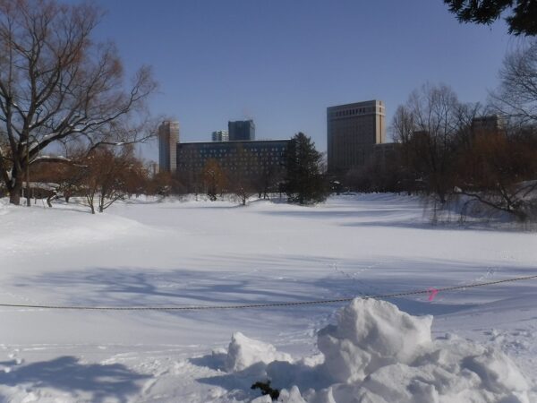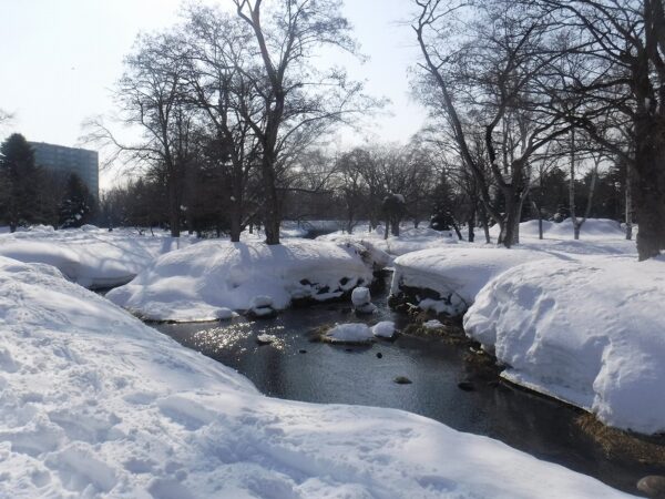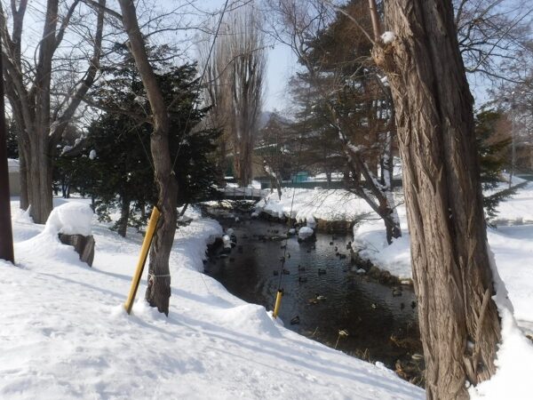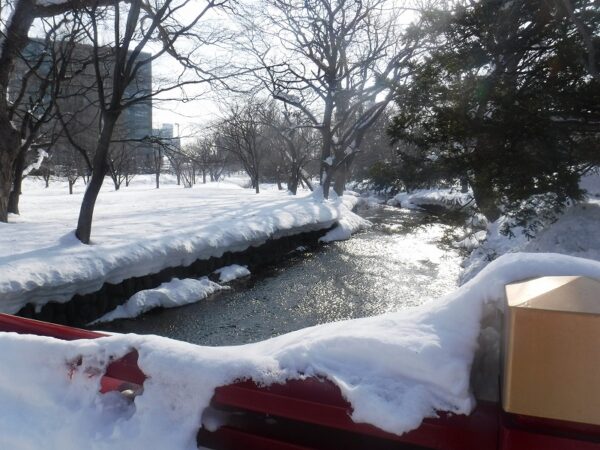 先週の豪雪から一転!!川面も景色を映し穏やかな冬日和です。ご存知の方も多くいらっしゃるかと思いますが、中島公園は、園内の中を、豊平川から分流した鴨々川という川が流れる、ちょっと珍しい公園です。今日は、その鴨々川の様子をご紹介します。