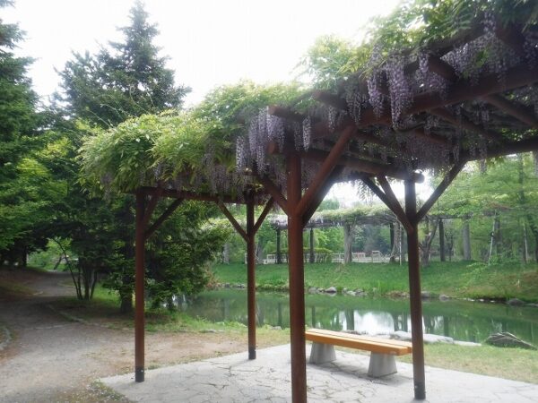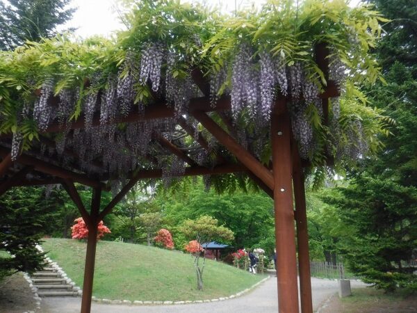お次は、コンサートホールkitaraへ向かう園路の藤棚です。中島公園の藤棚といえば、ここを連想される方が多いのではないでしょか。今だと、写真右下に写るライラックの花も一緒に楽しむ事ができます。