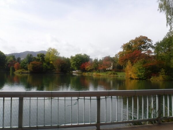 中島公園の紅葉見どころスポットの1つ、ボート乗場横のデッキから眺める景色の色づきは、もう一息。柔らかな色合いに包まれています。