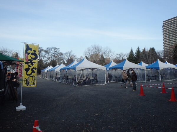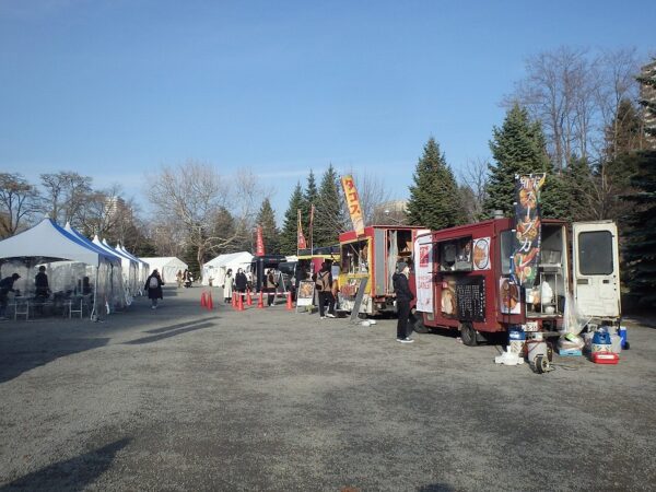 こちらフードエリアでは、北海道ならではの冬のグルメが味わえます。道産ステーキ弁当、スープカレー、タコスなど、毎日、9台ほど出店します。