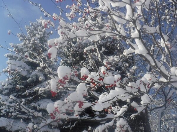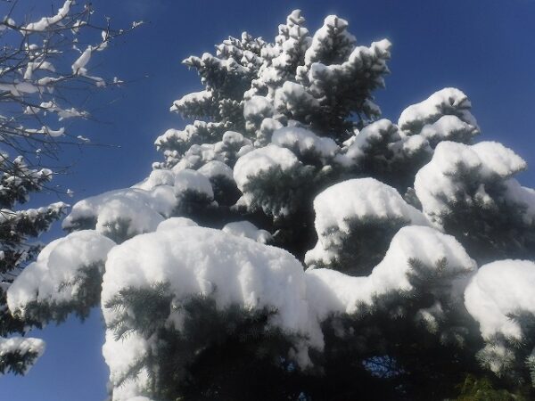 今日の雪は少し湿り気があったので、枝もしなり重そうです。下から見上げると、なかなかの迫力がありました。