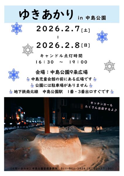 イベント情報, 公園ニュース, 管理事務所からのお知らせ ゆきあかりin中島公園の宣伝だよ 2026年1月13日 nakajima わたくし達、すたっふーが いちばん頑張るこのイベント。 もちろん、通常のお仕事も頑張ってます。 ですが このイベントに向けて 全員で作り上げる いろいろなものが たくさんのドラマを生み 昨年よりもより良い作品が誕生する 血と汗と涙の結晶の大イベントなのです。 ふふ。 ハードル爆上げ。 すたっふーがんばれー。 がんばるよー。